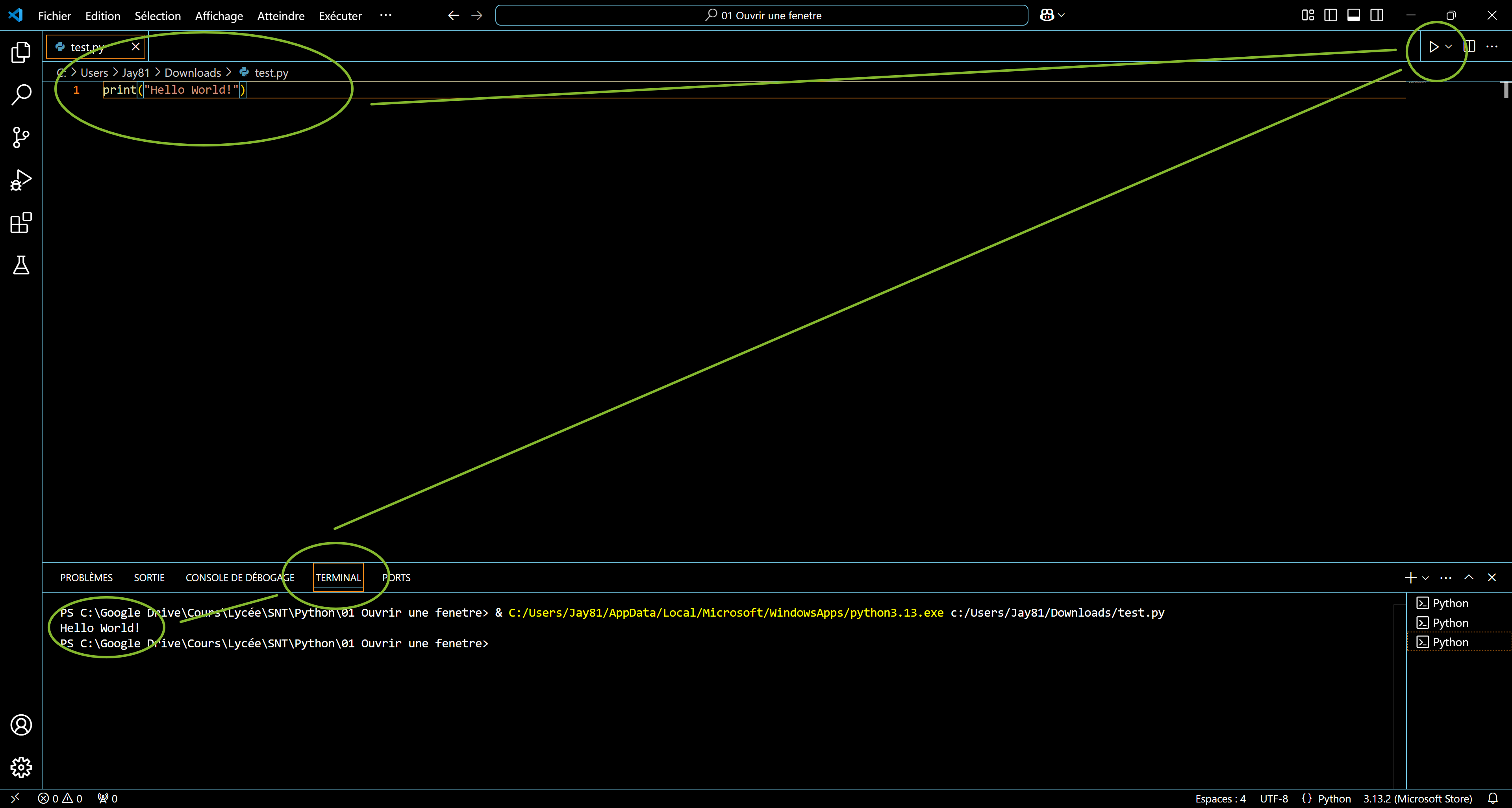 Now, your first exercise will be to replace "Hello World!" with whatever you want to test. Go ahead, have fun! But don't forget to indicate what you want to write between the quotation marks "", otherwise, it won't work! We'll see why, later. 😉 |