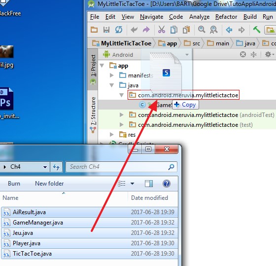 ) vers « java > com.android.meruvia.mylittletictactoe » en pressant la touche « Ctrl ». Cela permet de « copier » les fichiers, plutôt que de les déplacer. ![]()