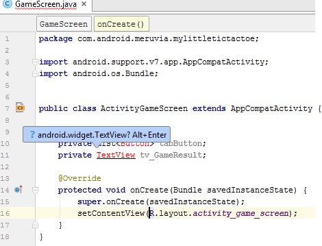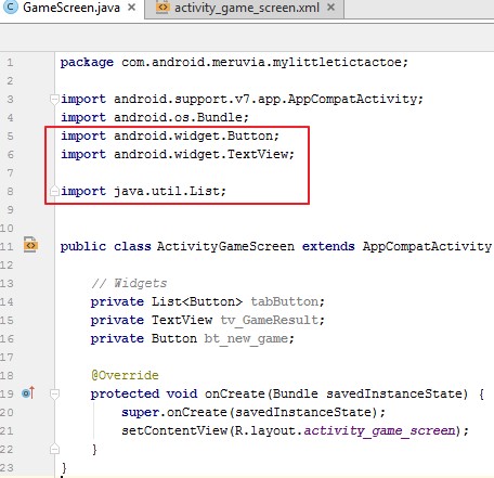 Ouvrez le fichier Java de notre activité « GameScreen » qui se trouve dans « app > java > com.android.meruvia.mylittletictactoe ».