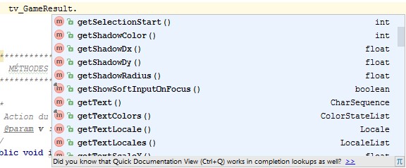 Android Studio est assez performant avec la « complétion automatique » (ou auto-completion en anglais). Par exemple, tapez « f » : « findViewById() » est le premier élément de la liste. Appuyez sur « Entrée » et le nom de la fonction est écrit directement !