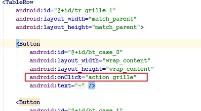 <Button android:id="@+id/bt_case_0" android:layout_width="wrap_content" android:layout_height="wrap_content" android:onClick="action_grille" android:tag="0" android:text="@string/case_tiret" />