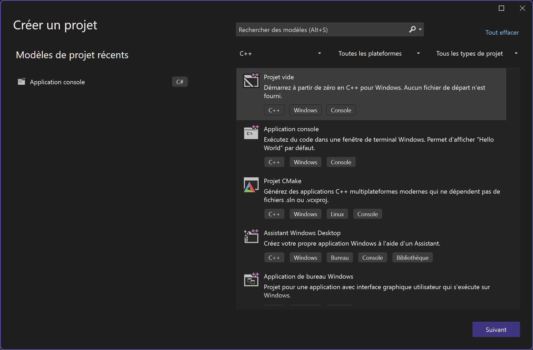 Ici, prenez bien garde à choisir votre projet en C++, car selon ce que vous aurez choisi, VS peut aussi gérer d'autres langages de programmation