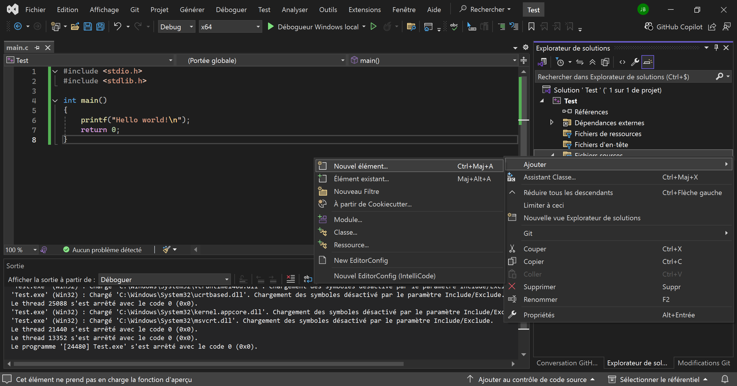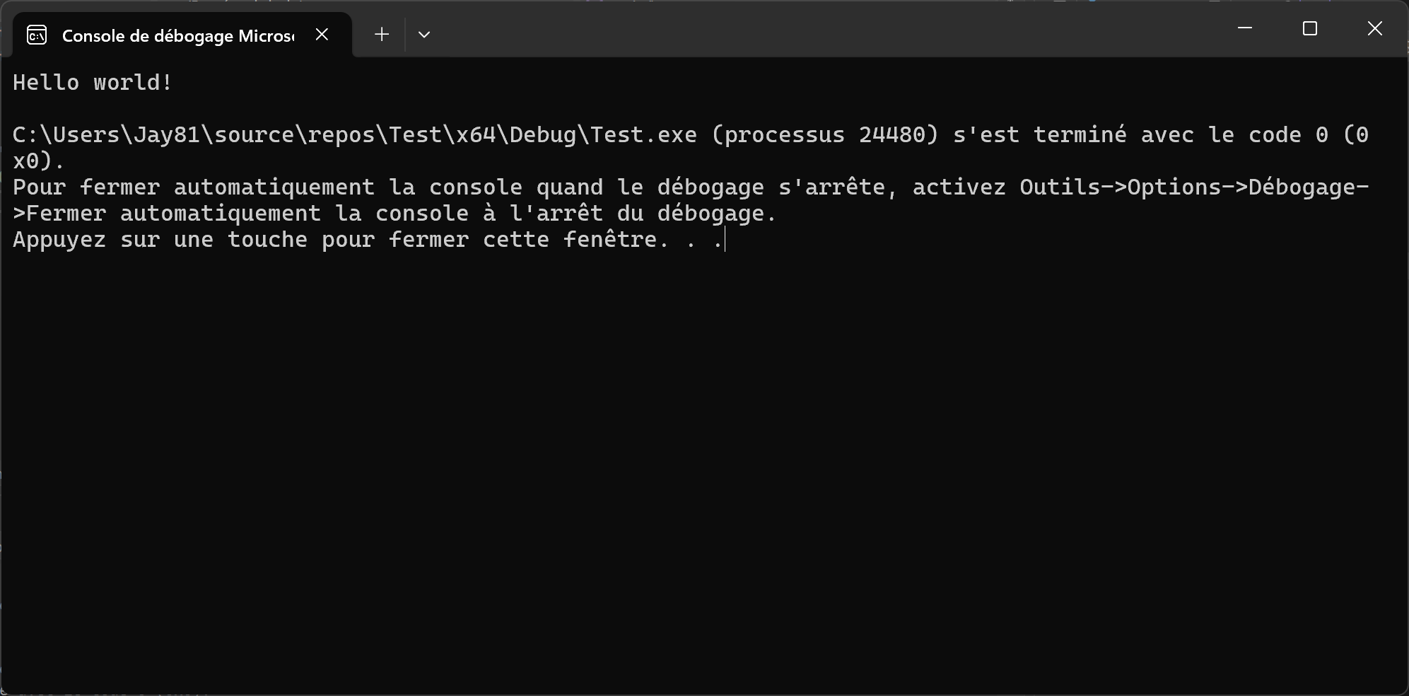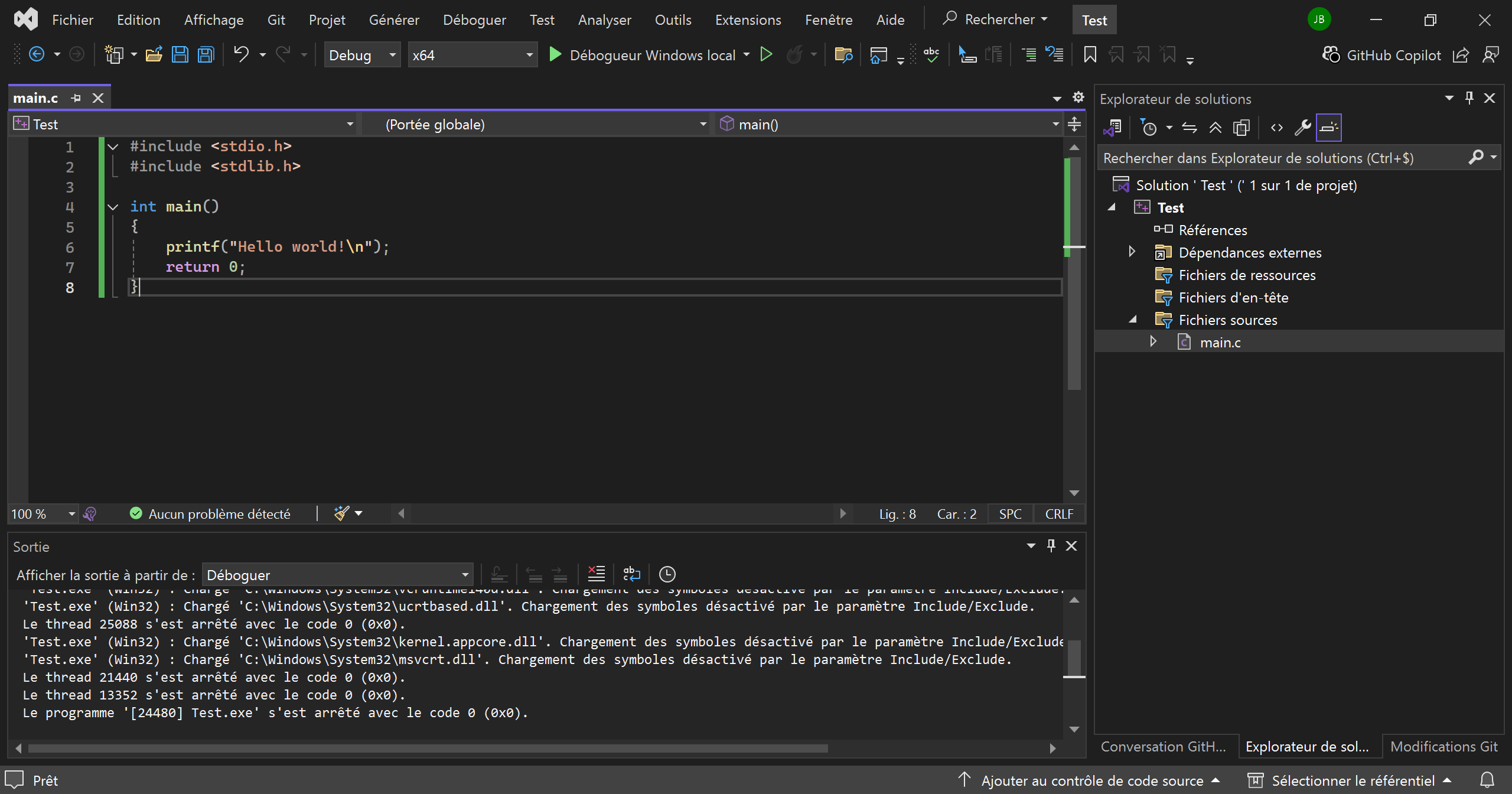 Eh voilà, vous êtes maintenant prêt à programmer en C avec Visual Studio 2022, et vous pouvez passer au chapitre suivant. ![]()