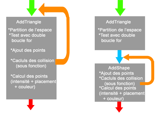 Avec un système à une fonction, nous avons notre double boucle for qui est appelée à chaque sous-division, ce qui nous prend beaucoup de ressources CPU, alors qu'avec le système à sous-fonction AddShape(), on teste une fois pour toute nos tiles pour notre triangle. Et cela nous permet d'économiser des centaines de doubles boucles for par frame, et c'est notre CPU qui dit merci !