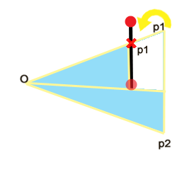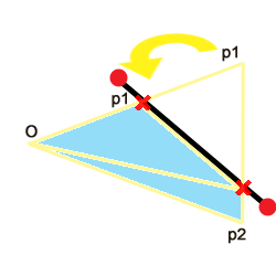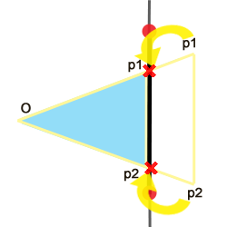 - Dans le premier cas, nous avons un mur qui coupe les deux cotés adjacents au centre (O). Ce cas est le plus simple puisqu'il ne nécessite aucune subdivision. Nous pouvons le régler en déplaçant les points p1 et p2 respectivement à l'intersection mur/segment [O p1] et mur/segment [O p2]. Cela se fait simplement en calculant le point d'intersection des droites formé par les segments.
