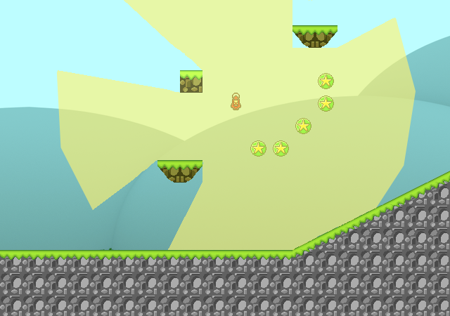 Comme vous pouvez le voir, la lumière s'arrête au sol et au mur. Les pentes seront gérées aussi, mais les plateformes posent problème. La tile affichée n'est pas carrée, mais la lumière la gère comme un carré, créant ce carré sans lumière.