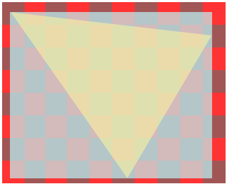Sur cette représentation de notre partition de l'espace pour un triangle, nous avons notre triangle en jaune, le rectangle crée à partir de la boîte englobante du triangle (la SFML gère la création du rectangle nativement), et notre damier rouge, là où les tiles seront testées. Notez que le damier dépasse notre boite englobante pour pouvoir tester toutes nos tiles.