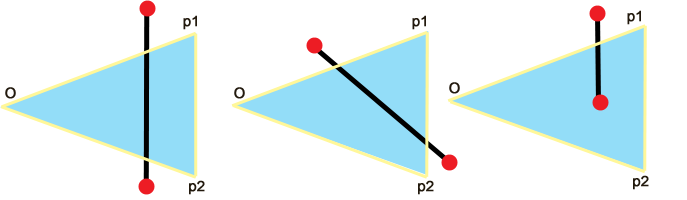 - Le second cas est plus complexe. Le mur coupe un côté adjacent et le côté opposé. Il est cette fois-ci nécessaire de subdiviser le triangle au niveau de l'intersection mur/côté opposé, et de replacer le point p1 ou p2 (selon la cas) à l'intersection mur/segment [0 p1] ou mur/segment [0 p2]. Il ne faudra pas oublier de tester les collisions avec le nouveau sous-triangle.