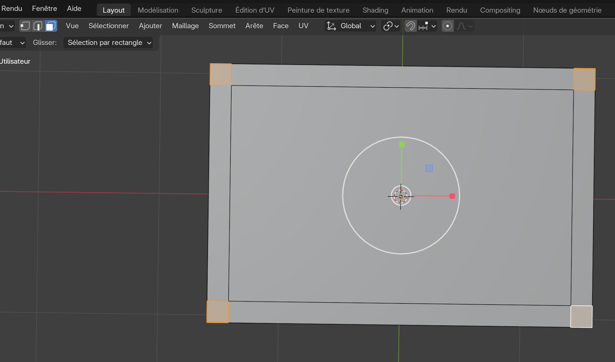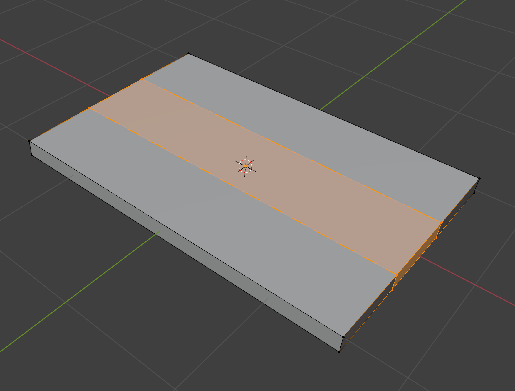 Pour l'instant, on va tout sélectionner avec A, puis faire un cut en utilsant CTRL + R, puis la molette, pour faire 2 coupes et cliquez pour qu'elles se mettent par défaut en plein milieu, comme ceci :
