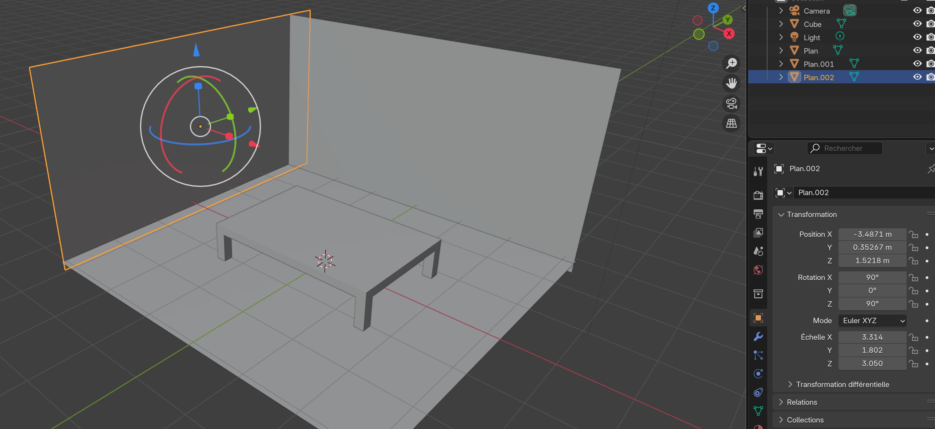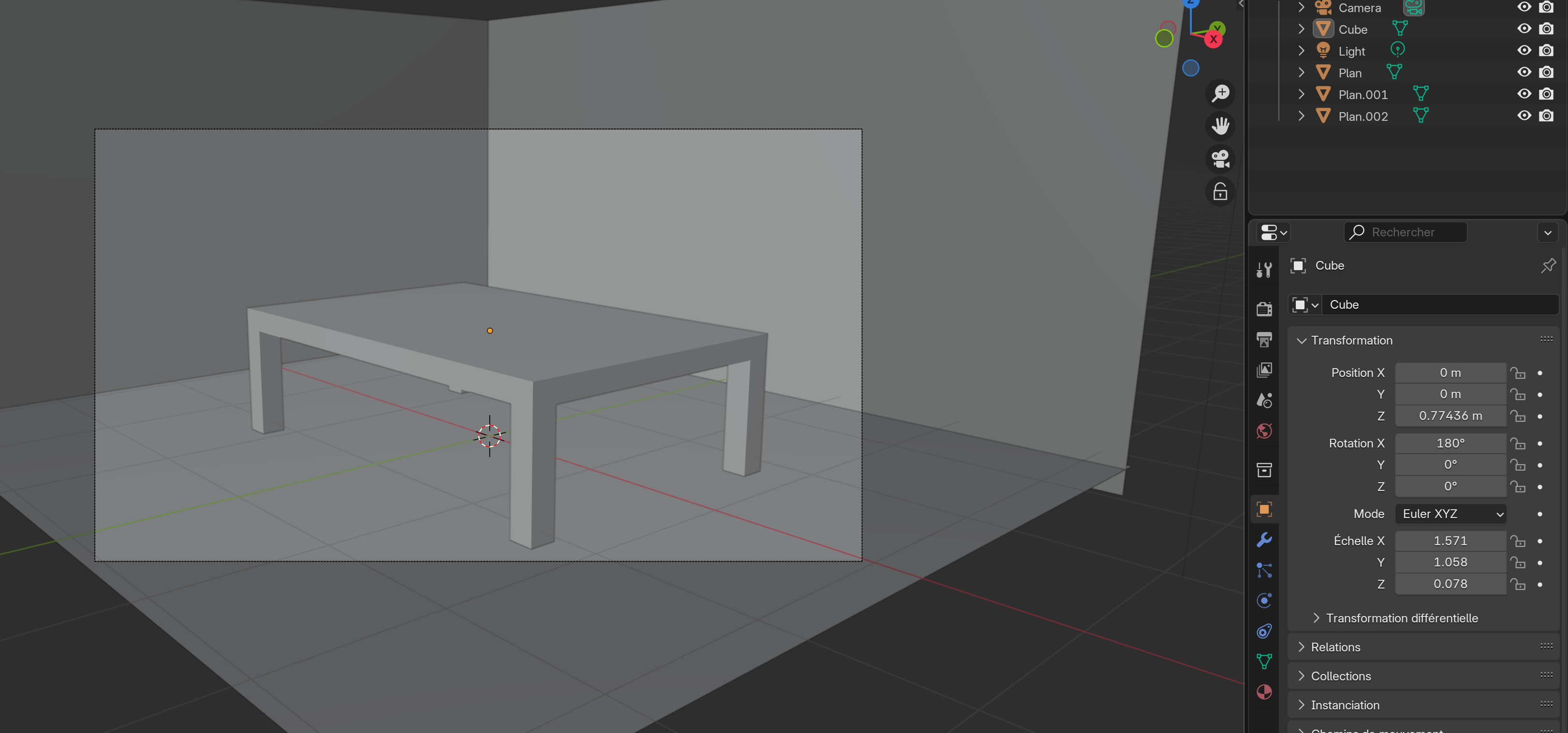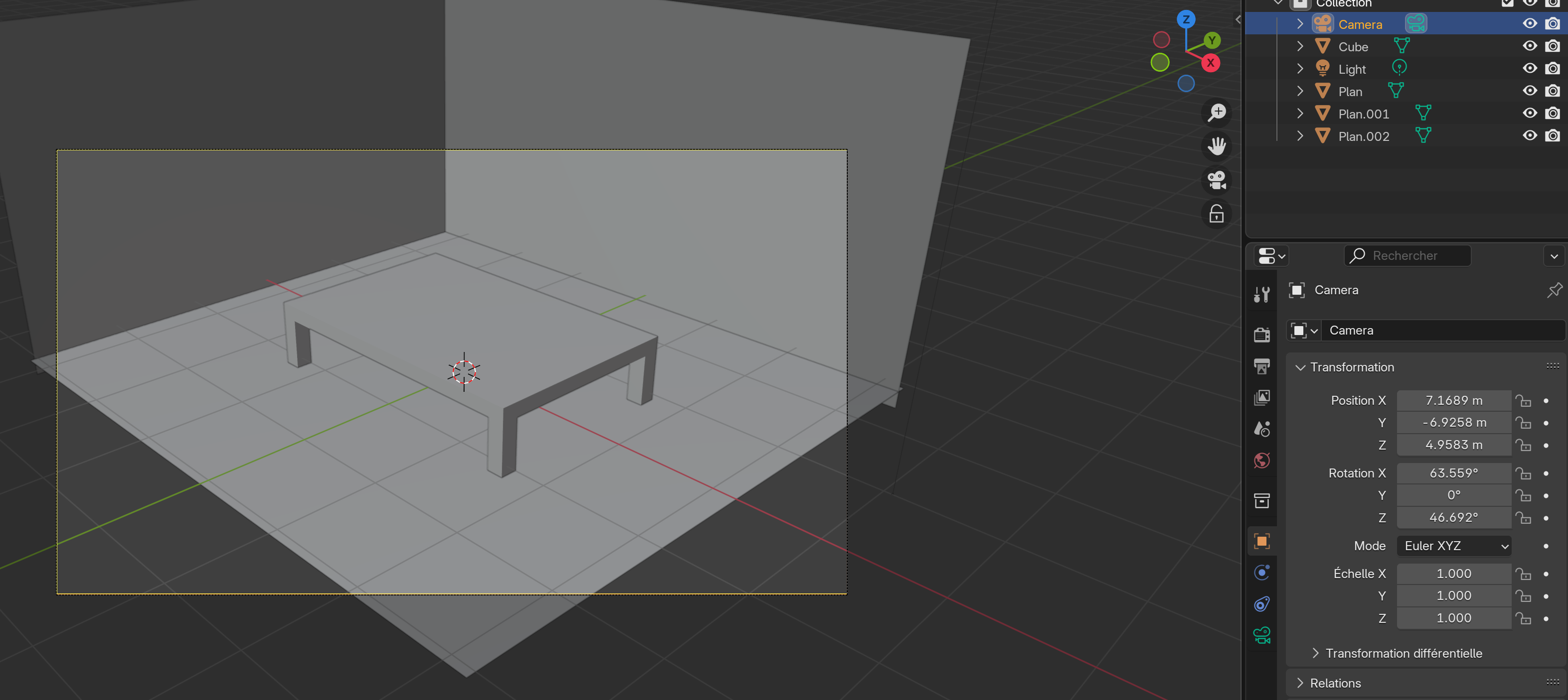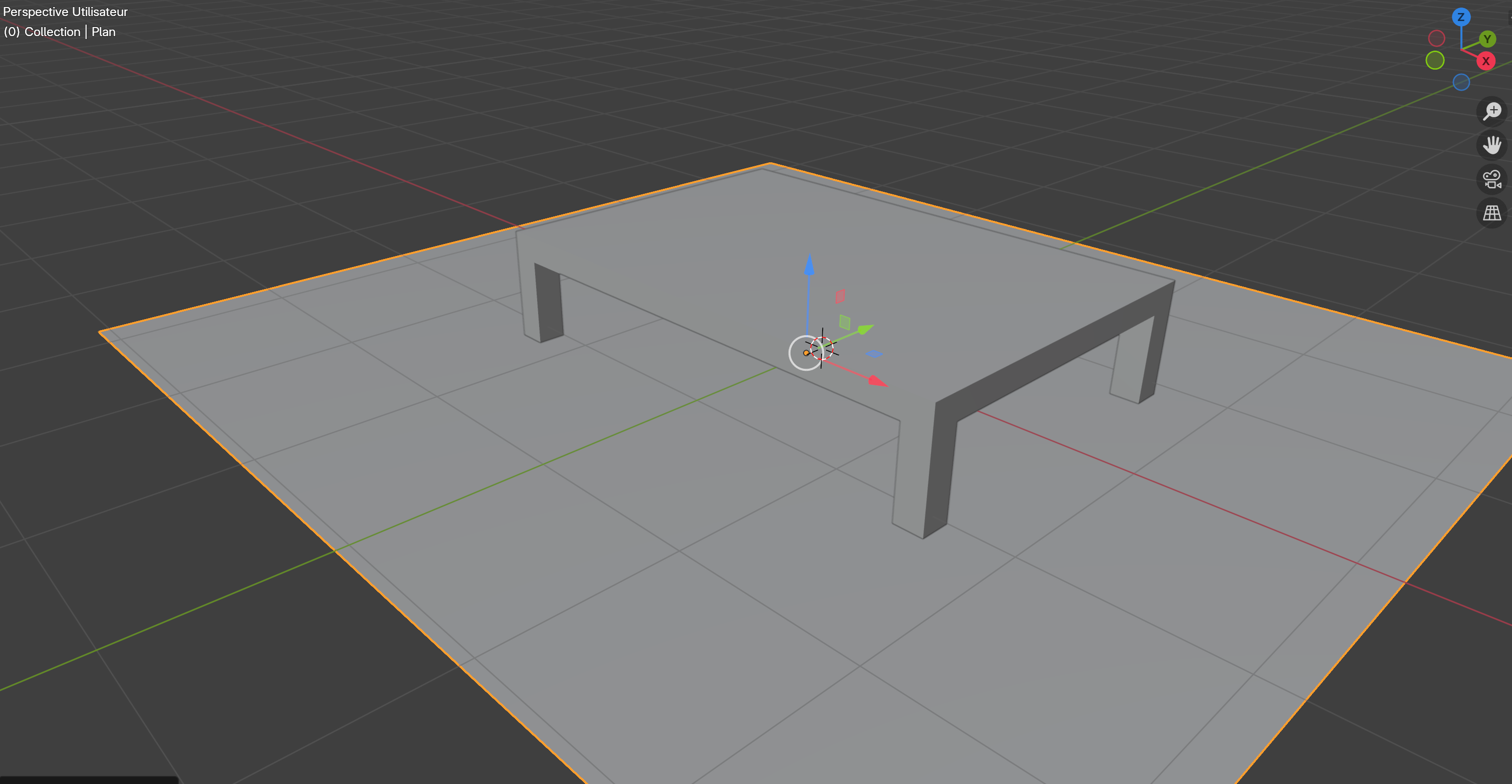 Pour cela, choisissez Ajouter -> Maillage -> Plan et redimensionnez-le pour créer le sol. Ajustez aussi votre table pour que ses pieds touchent bien le sol.