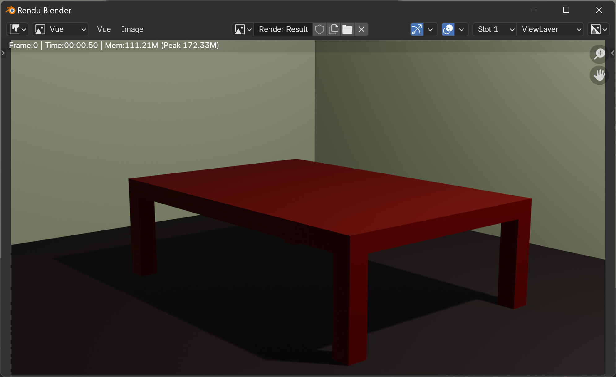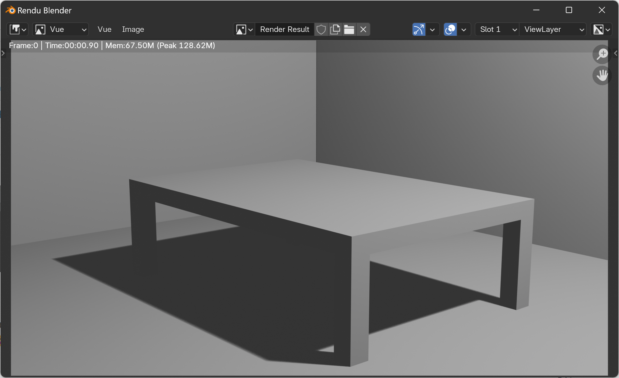 Sauvegardez, et cliquez sur Rendu -> Rendre l'image pour voir le résultat. Ce n'est pas top, mais au moins, on peut voir votre table ! 😅