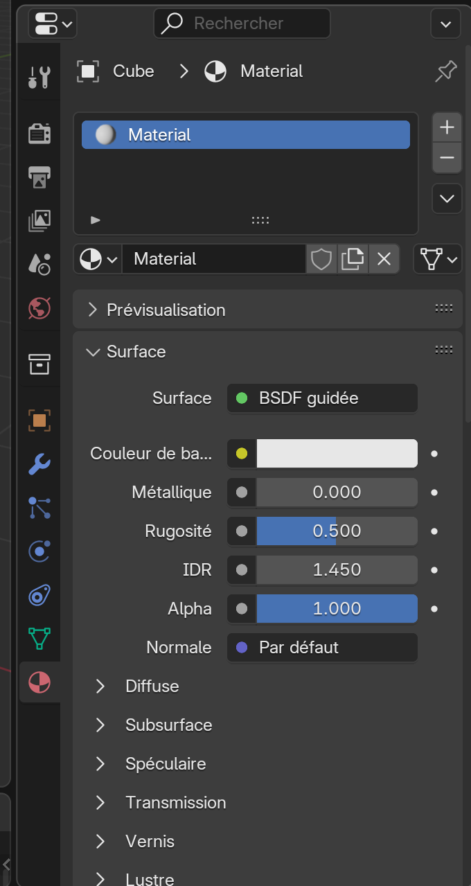 Pour cela, sélectionnez l'objet que vous voulez colorer (la table, le sol ou les murs), puis choisissez Matériau à droite. S'il n'y en a pas, cliquez sur Nouveau pour en créer un. Vous pouvez changer leurs noms pour les retrouver plus facilement.