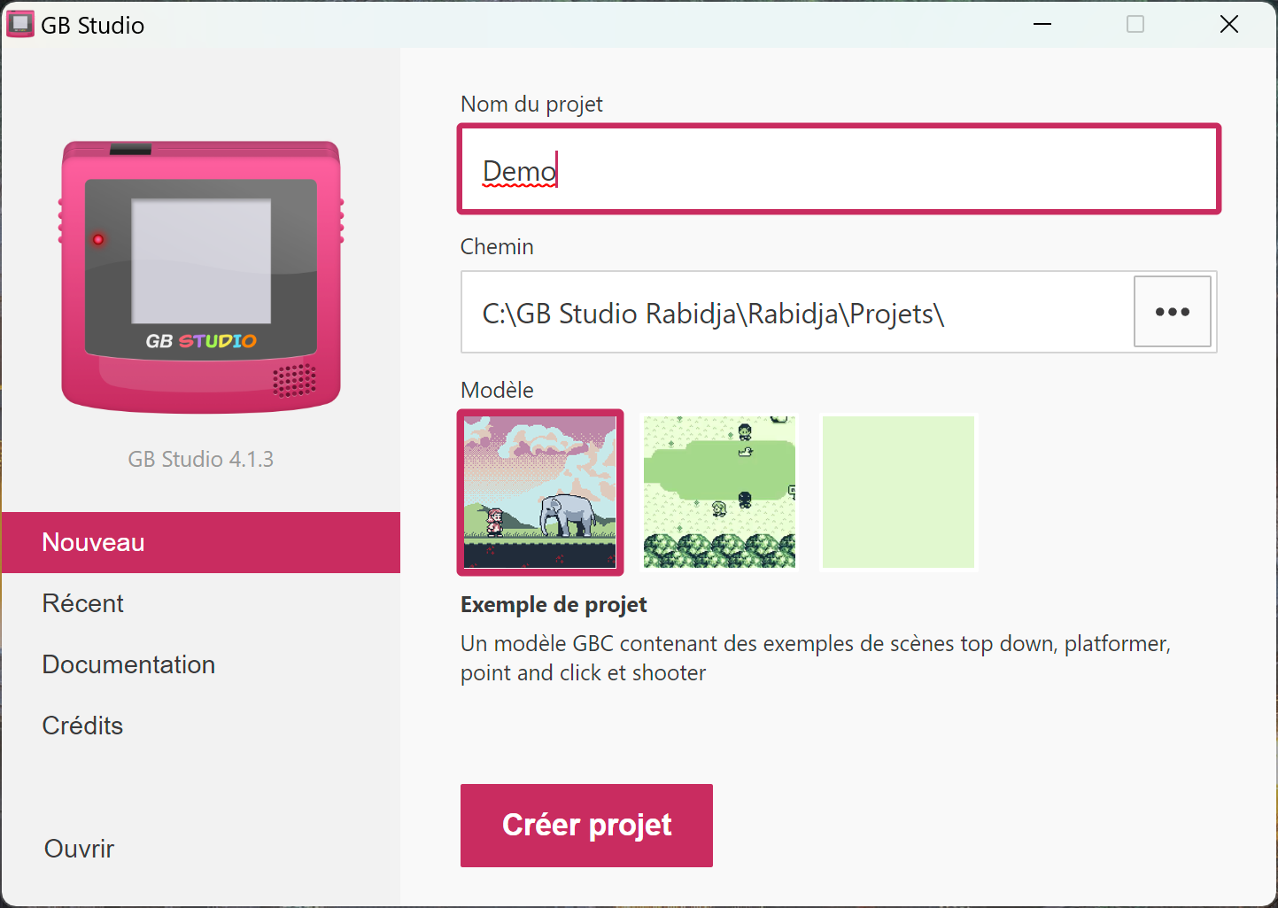 Quand vous ouvrez GB Studio pour la première fois, il vous propose de créer une démo pour Game Boy Color. Je vous invite à la tester et à la garder sous le coude car beaucoup d'éléments dedans pourront vous servir pour créer votre propre jeu.