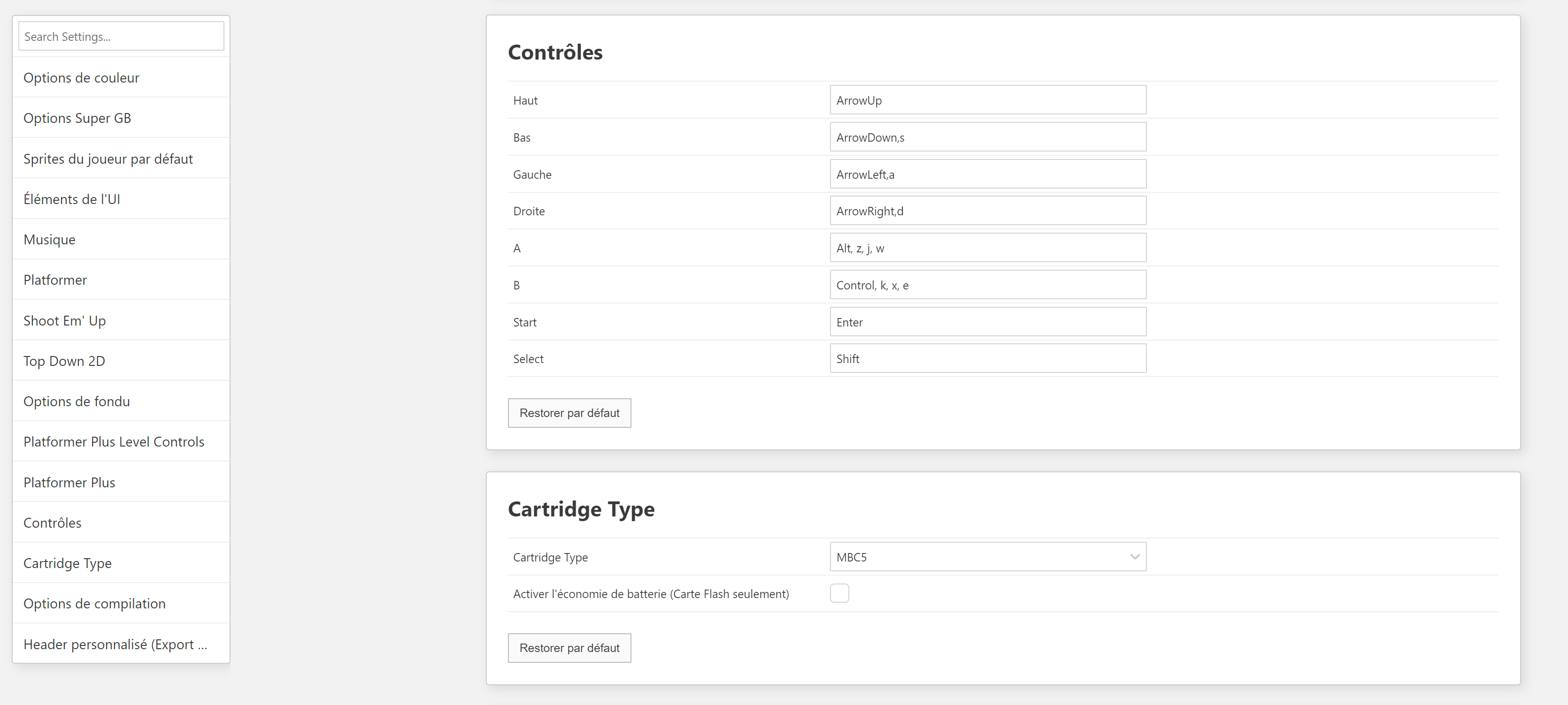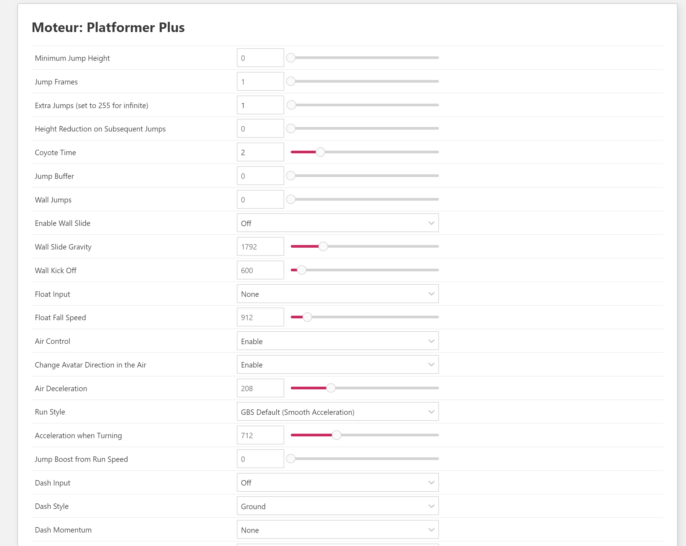 Ici, vous pouvez aussi changer plein de paramètres, notamment en allant dans Platformer et Platformer+. J'ai déjà tout préréglé mais vous pouvez les changer pour adapter le jeu à vos souhaits (hauteur du saut, double jump, etc.).