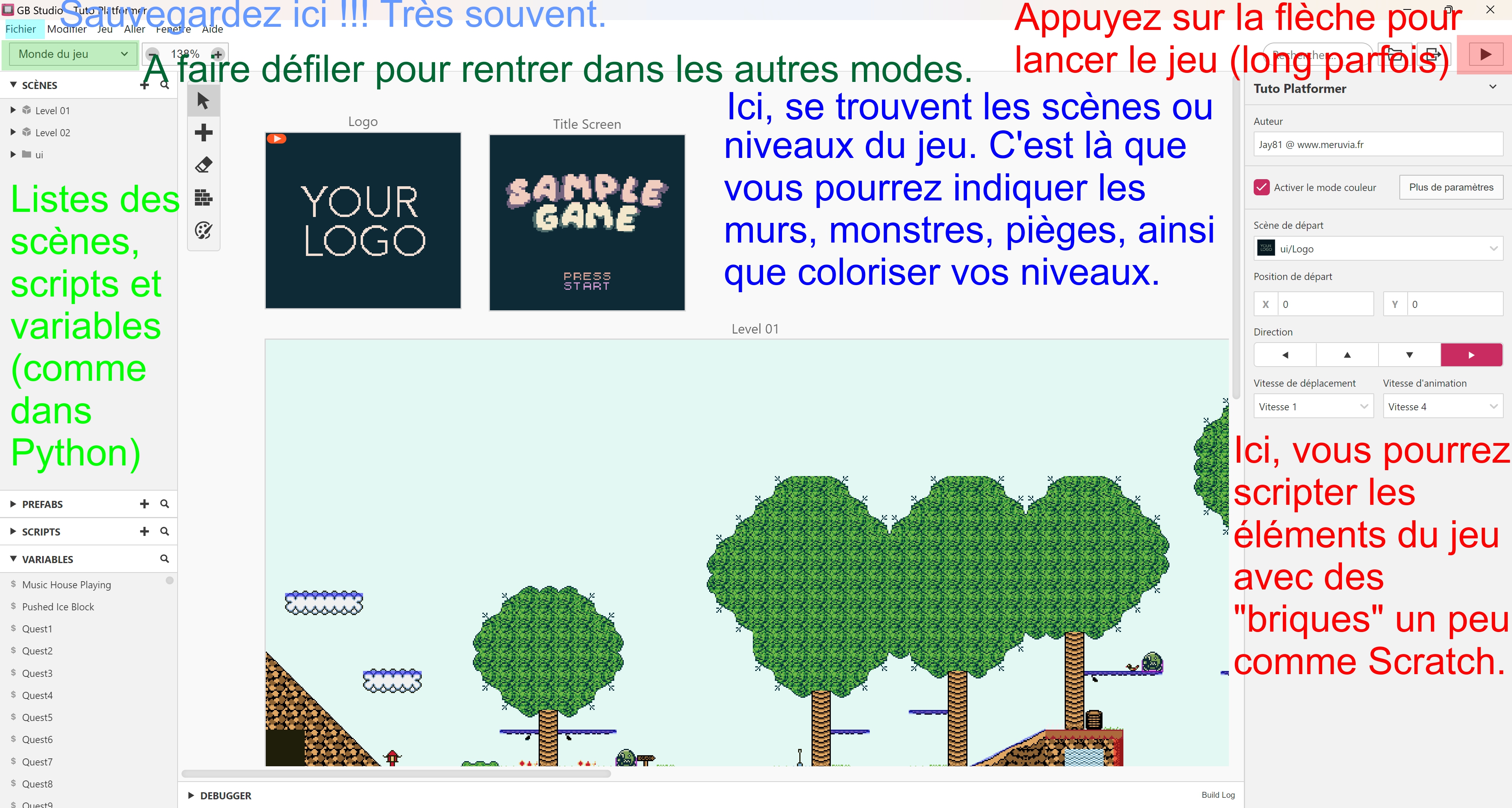 Dans ce court tutoriel, nous allons voir quelques bases pour créer un petit jeu de plateformes sur la véritable Game Boy Color de Nintendo (Oui, il pourra fonctionner sur votre machine 😉) grâce au génialissime logiciel GB Studio de Chris Maltby qui va vraiment nous faciliter la tâche ! 🥳