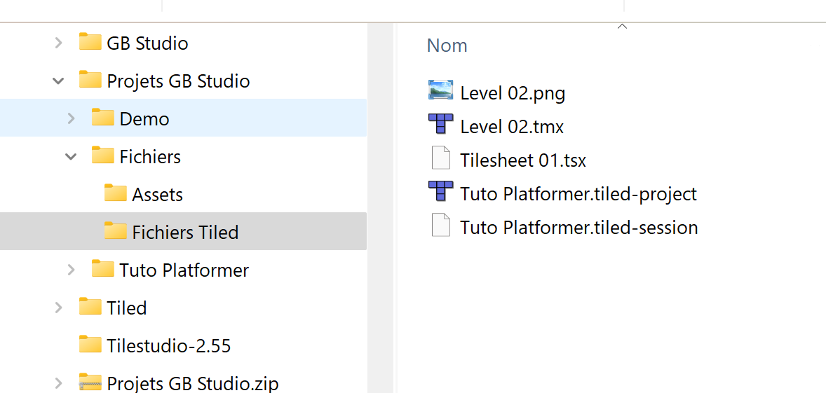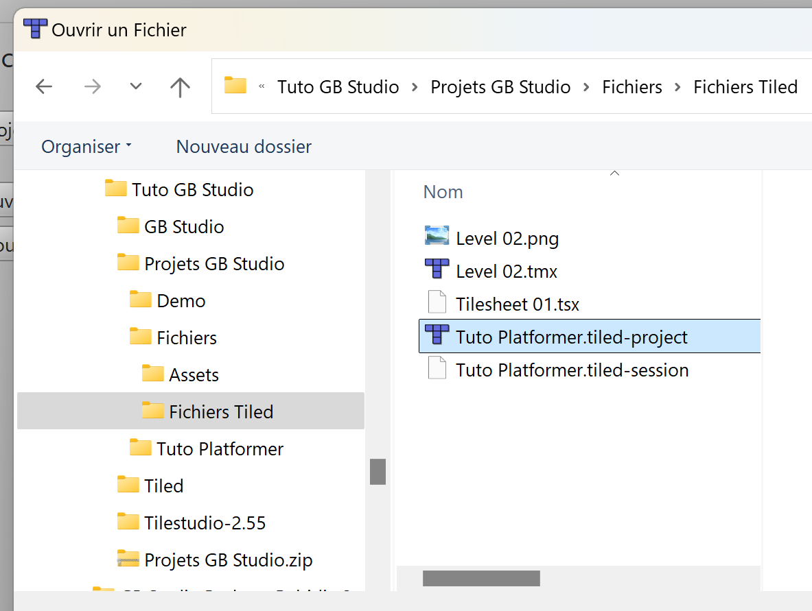 Là cherchez le projet Tuto Platformer.tiled-project que j'ai précréé dans le dossier Tuto GB Studio/Projets GB Studio/Fichiers Tiled.