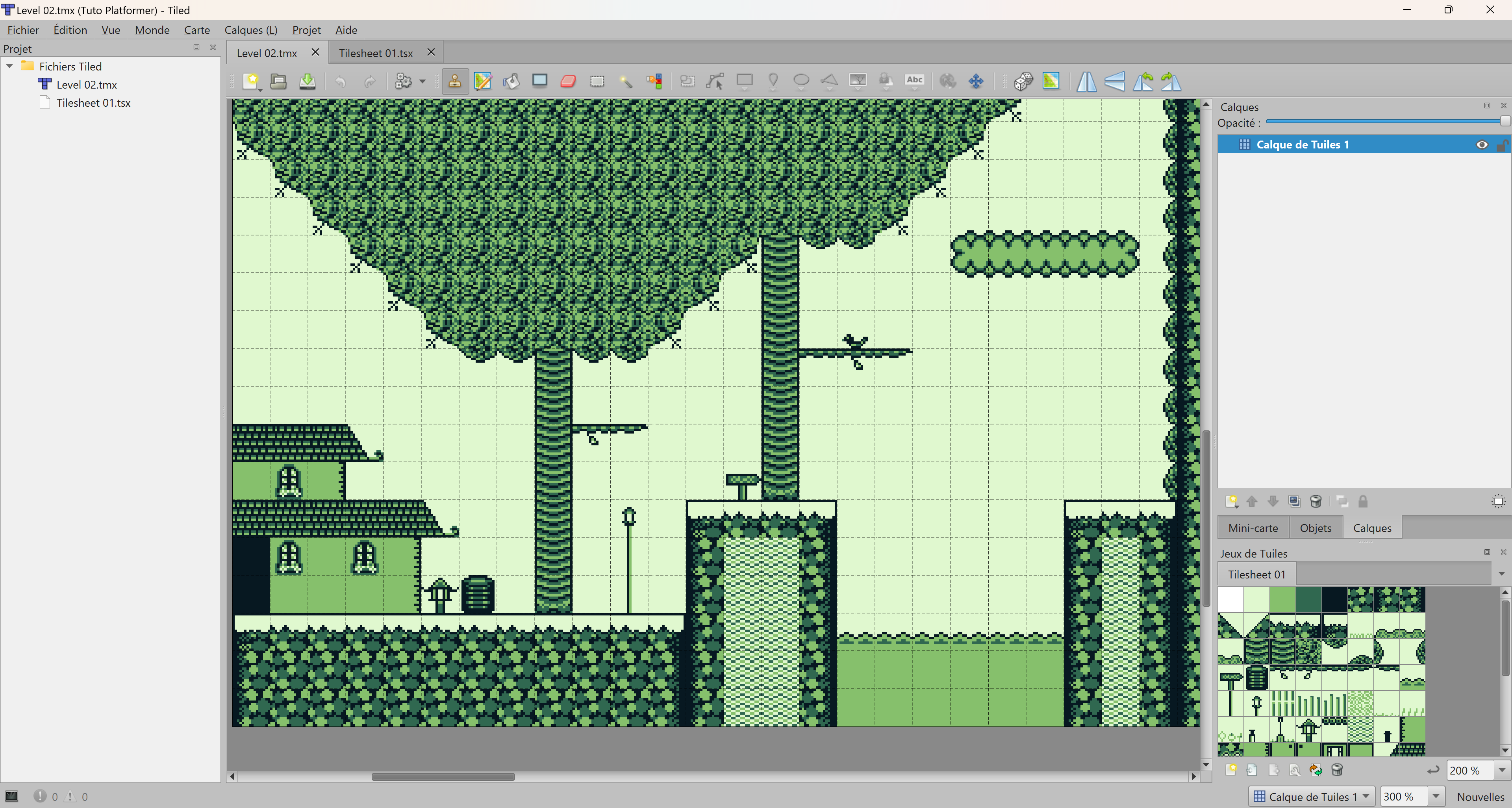 - dans la colonne de gauche se trouvent les fichiers du projet : juste 2 pour l'instant : le niveau 2 et le tileset 1.