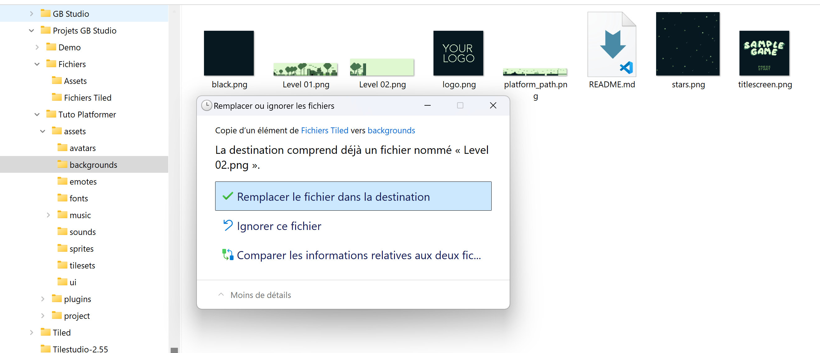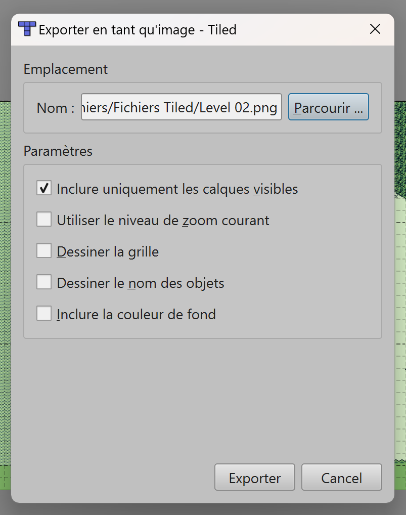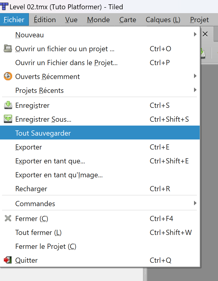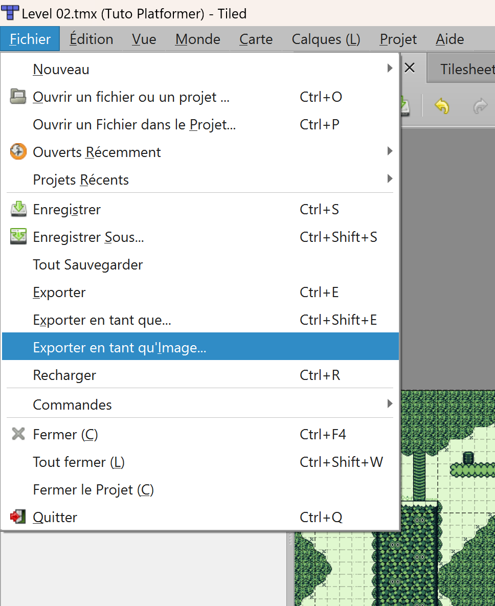 Exportez-le puis allez dans les Fichiers Tiled, sélectionnez le fichier Level 02.png fraîchement exporté et copiez-le dans le dossier Tuto Platformer/assets/backgrounds.