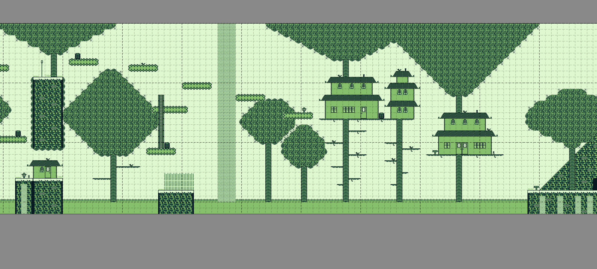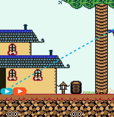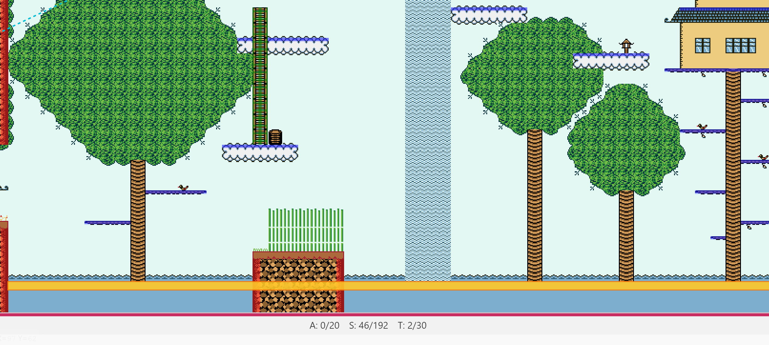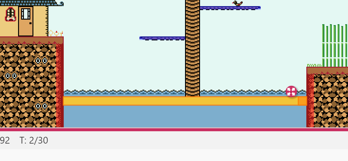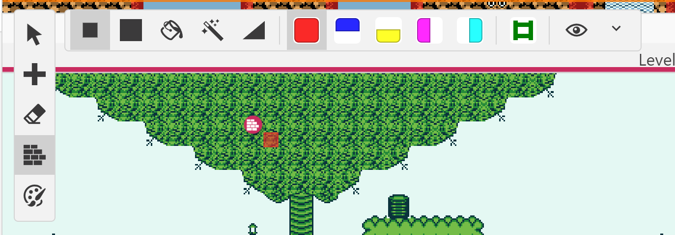 - Rectangles de couleur : indique des tiles qui ne sont franchissables que par un côté : on utilisera le bleu marine, par exemple, pour les tiles plateformes franchissables par le bas mais solides sur le dessus. 😜