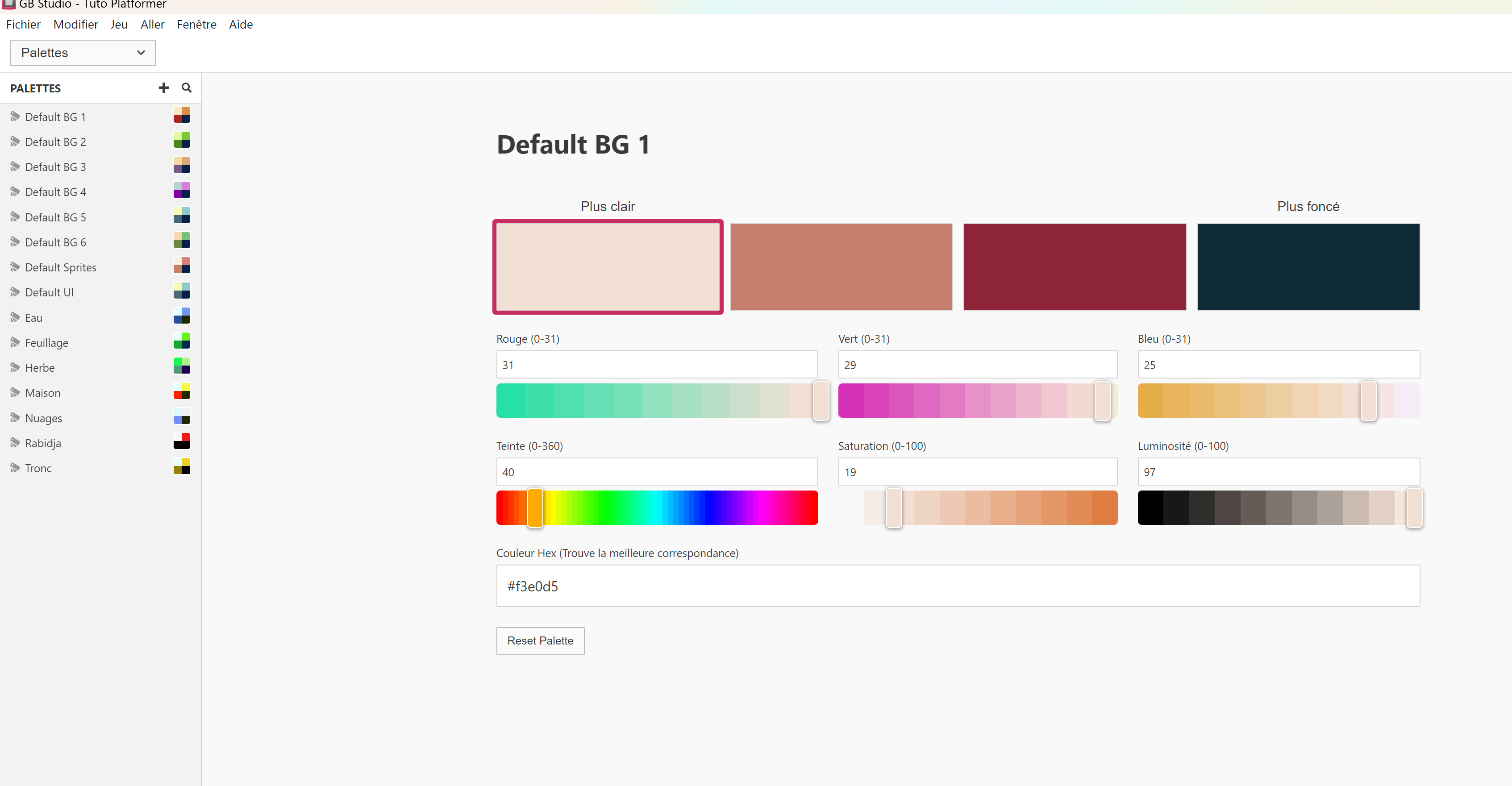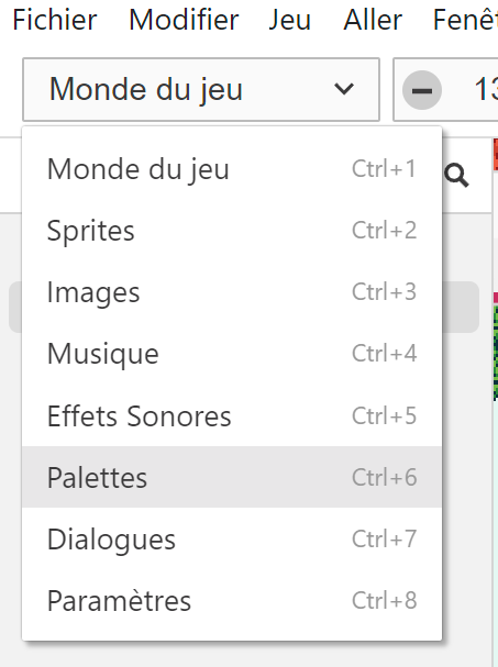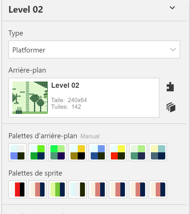Là, vous pouvez modifier les palettes par défaut et celles que j'ai déjà créées pour le niveau 1. Vous pouvez aussi en créer de nouvelles.