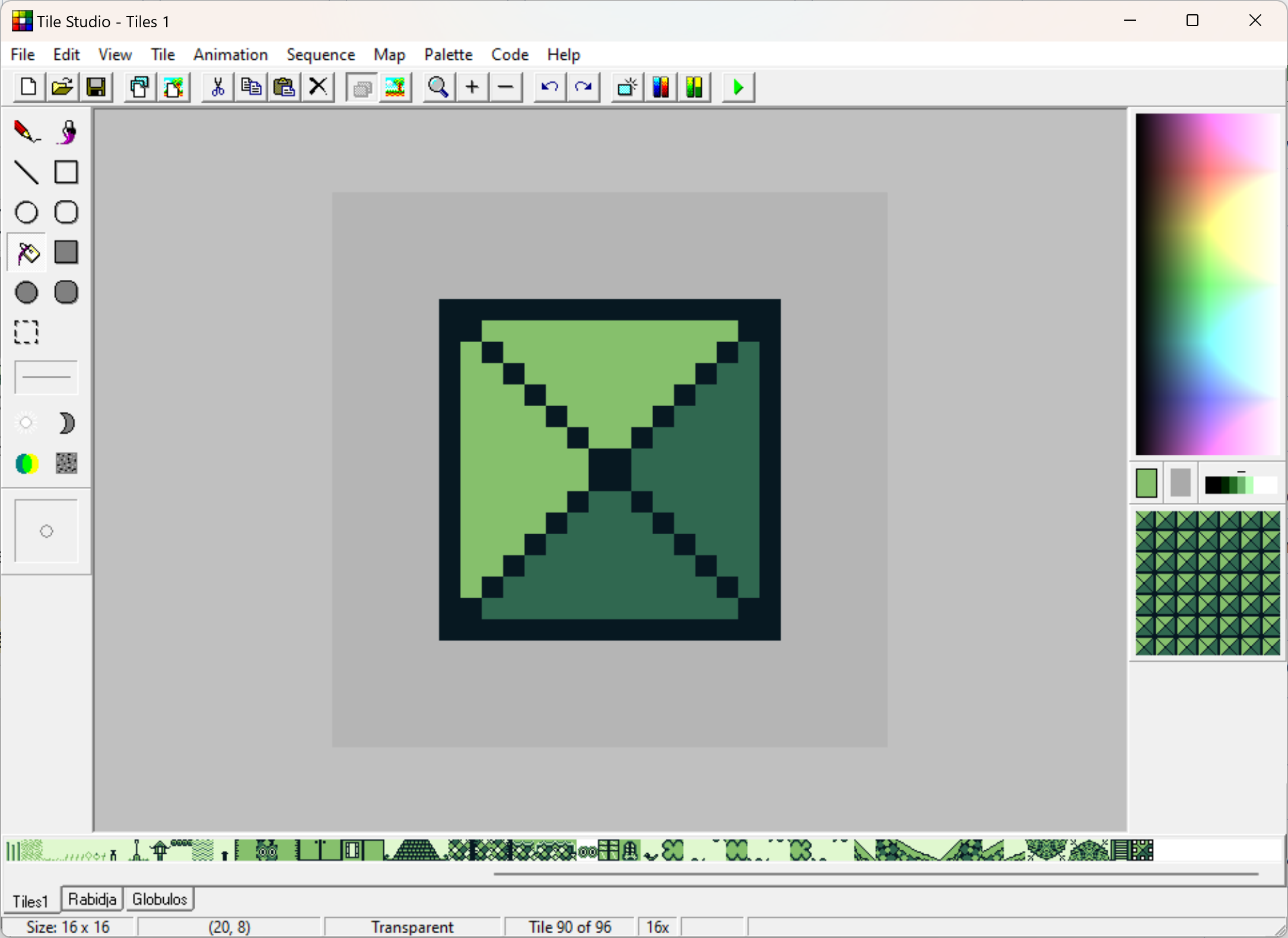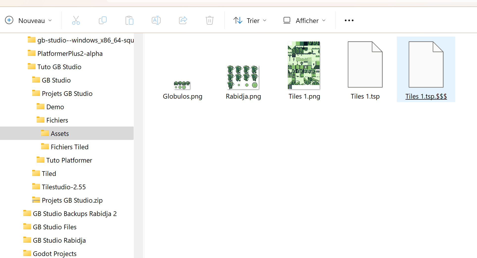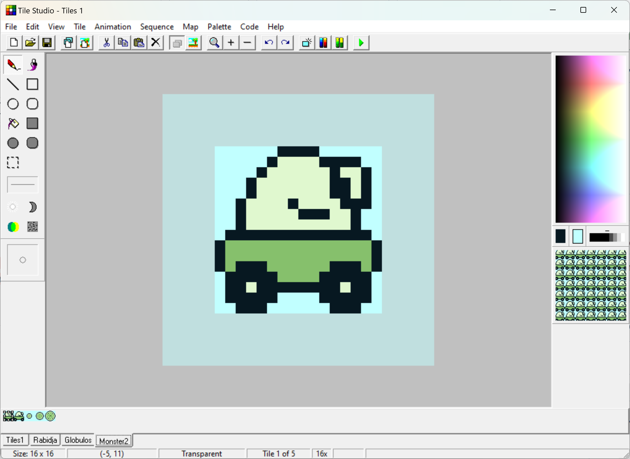 Le programme ouvrira alors le projet qui contient les sprites de Rabidja, du Globulos et le tileset 1. Vous pouvez naviguer dedans en cliquant sur les onglets en bas :