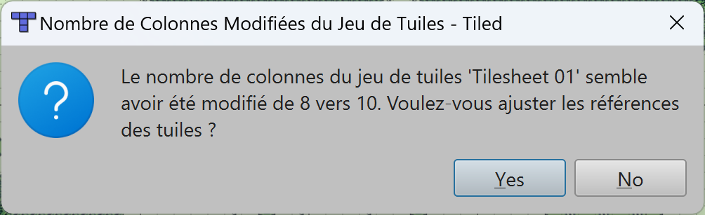Pour le tileset, évitez de changer l'ordre des tiles si vous ne voulez pas avoir à refaire tous vos niveaux (ou créez un nouveau tileset). Vous pouvez ensuite enregistrer par-dessus l'ancien et si vous ouvrez Tiled à nouveau, il verra que le fichier a changé et vous demandera si vous voulez le mettre à jour. Cliquez sur oui pour intégrer les nouvelles tiles et faire de nouvelles.