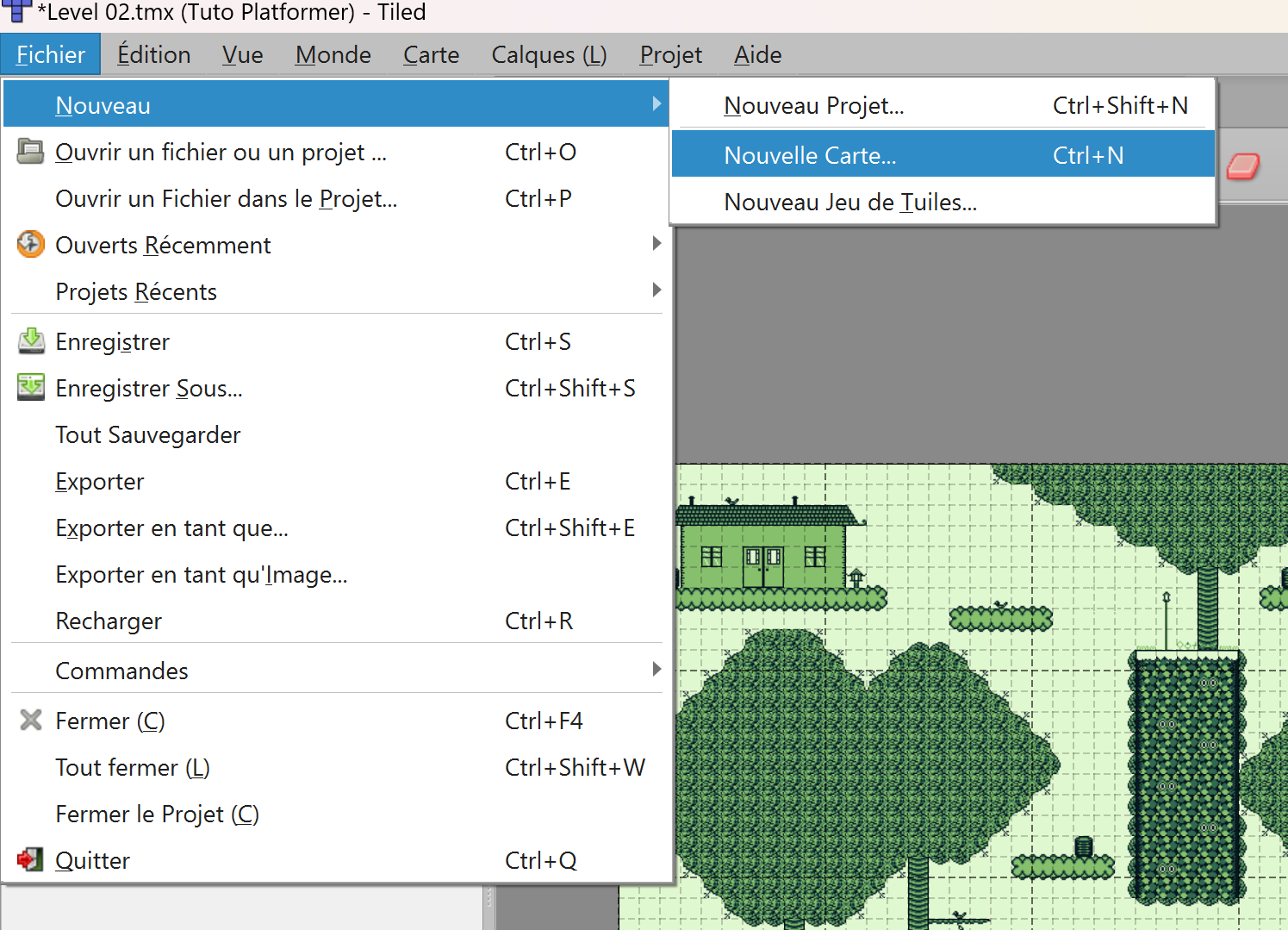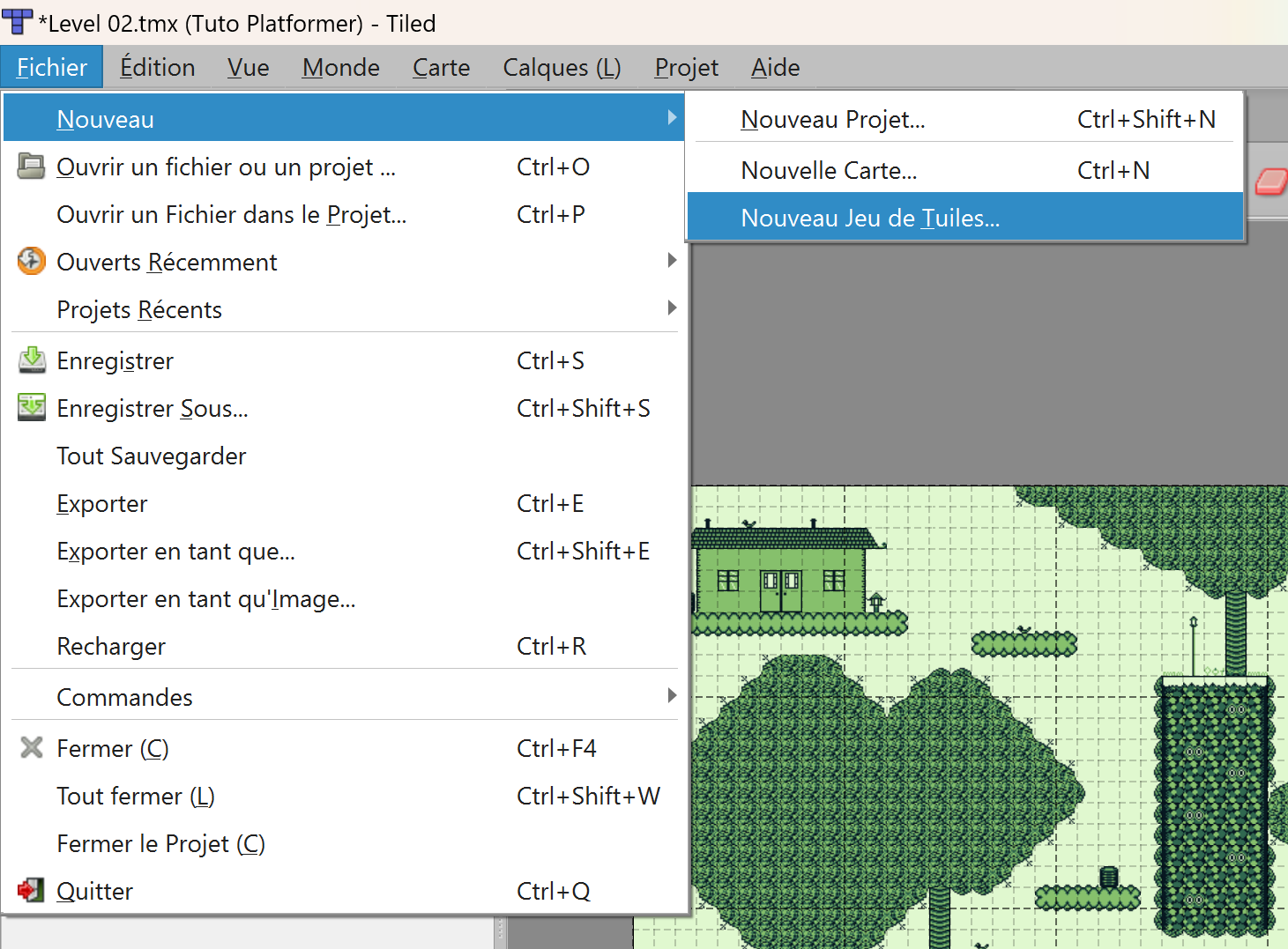 Pour ajouter un nouveau tileset sous Tiled, cliquez sur Fichier / Nouveau / Nouveau Jeu de Tuiles :