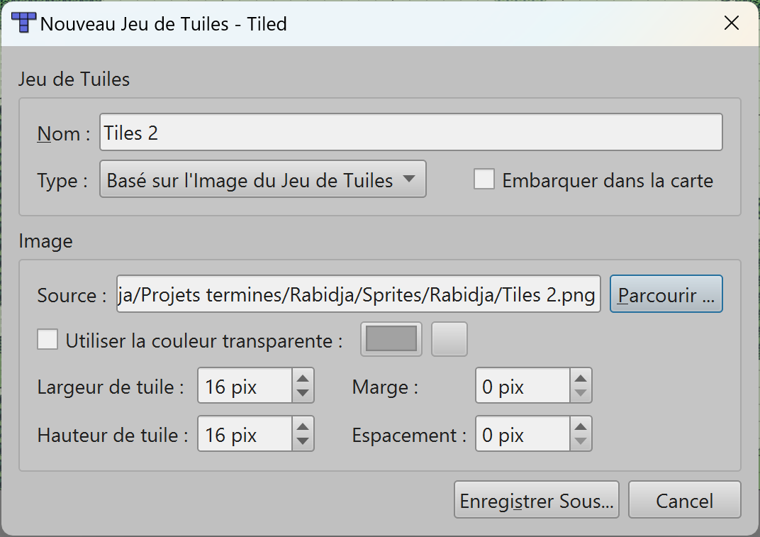 Indiquez bien la taille des tiles en pixels : 16 x 16 pixels dans notre cas.
