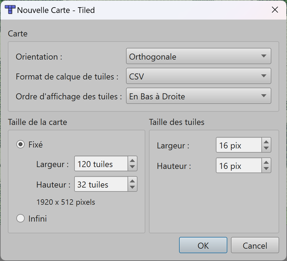 Là, choisissez la taille de la map en nombre de tiles de 16 x 16 pixels :