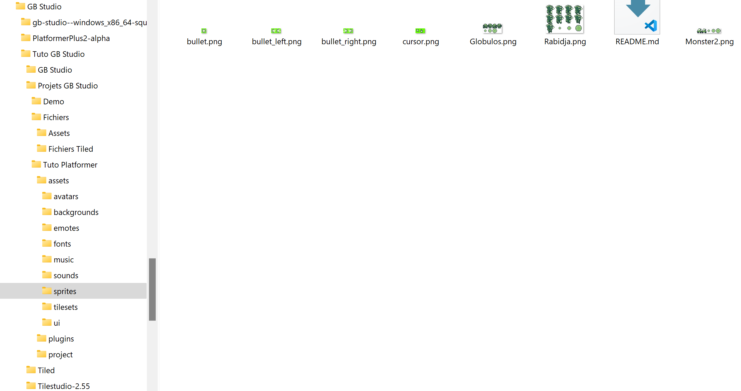 Commencez par copier vos nouveaux sprites / tilesets du dossier Projets GB Studio / Fichiers / Assets vers Tuto Platformer / assets / backgrounds pour les niveaux et sprites pour les monstres.