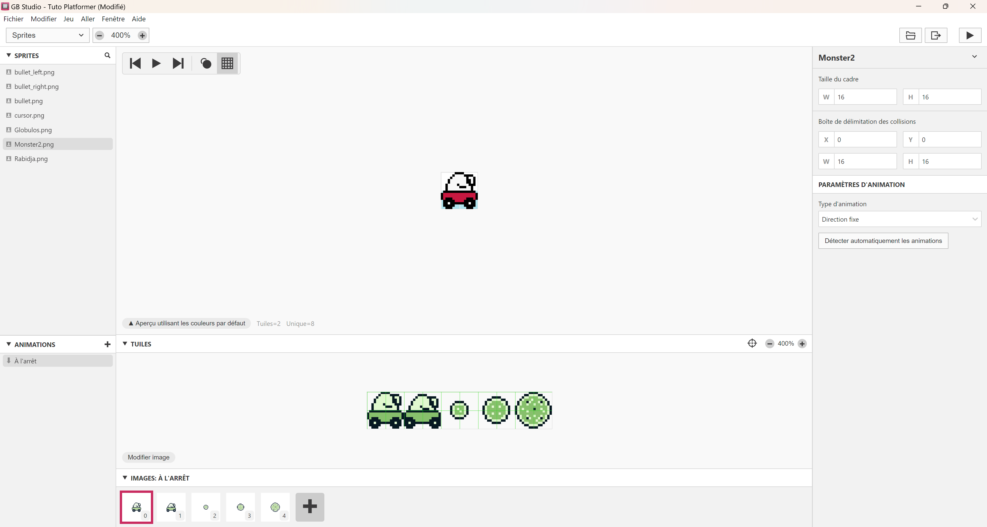 Voilà pour les sprites. Vous pouvez aussi reprendre ceux du Monstre 1 et de Rabidja pour les modifier de la même façon avec vos propres sprites. 😉