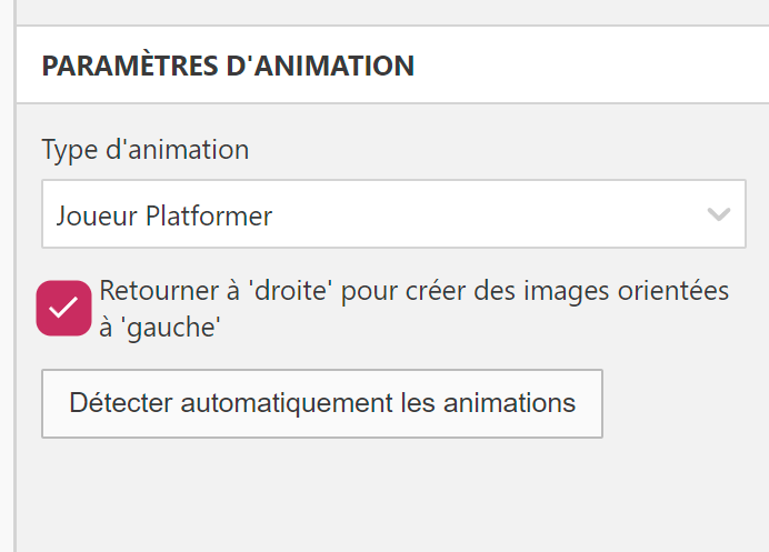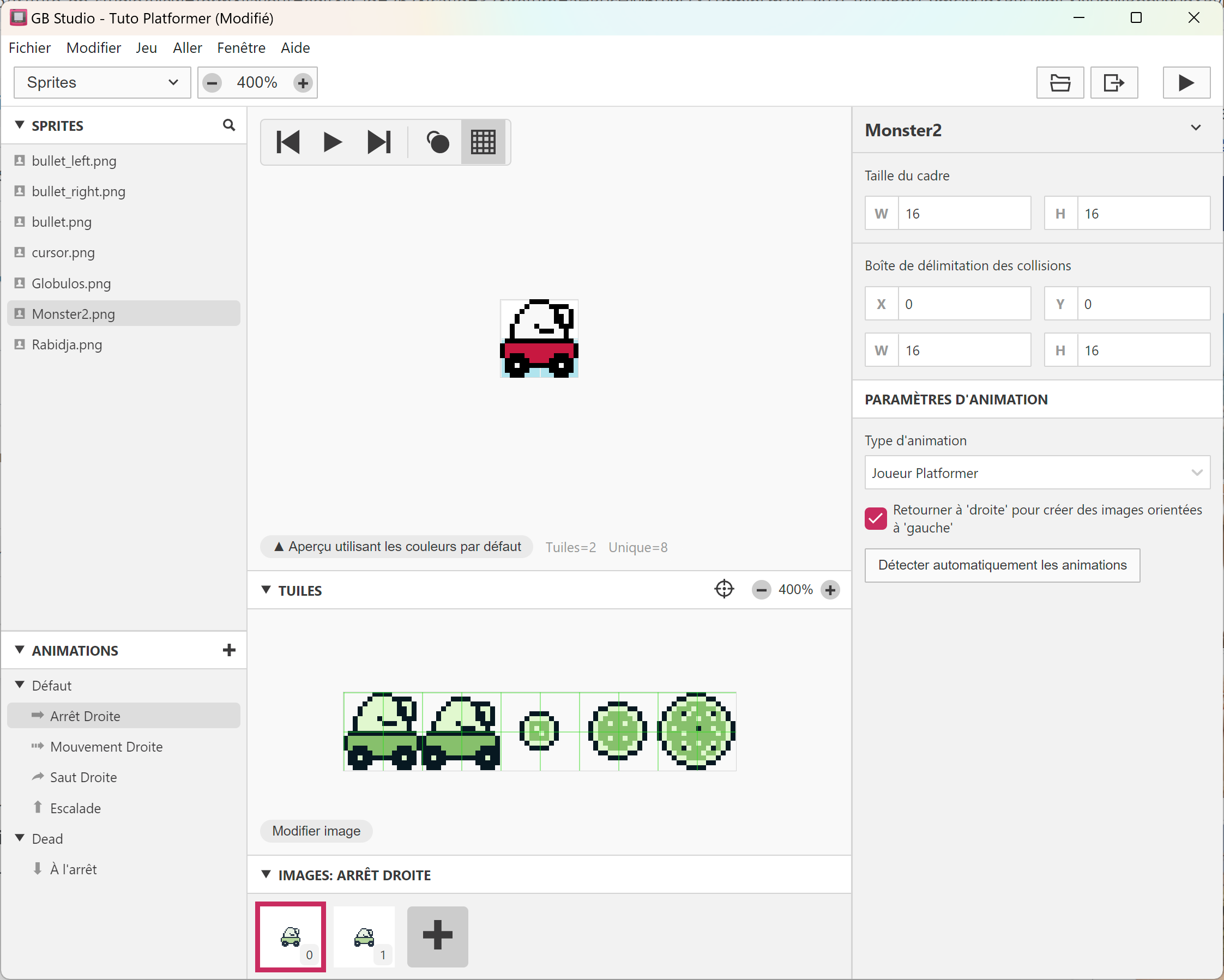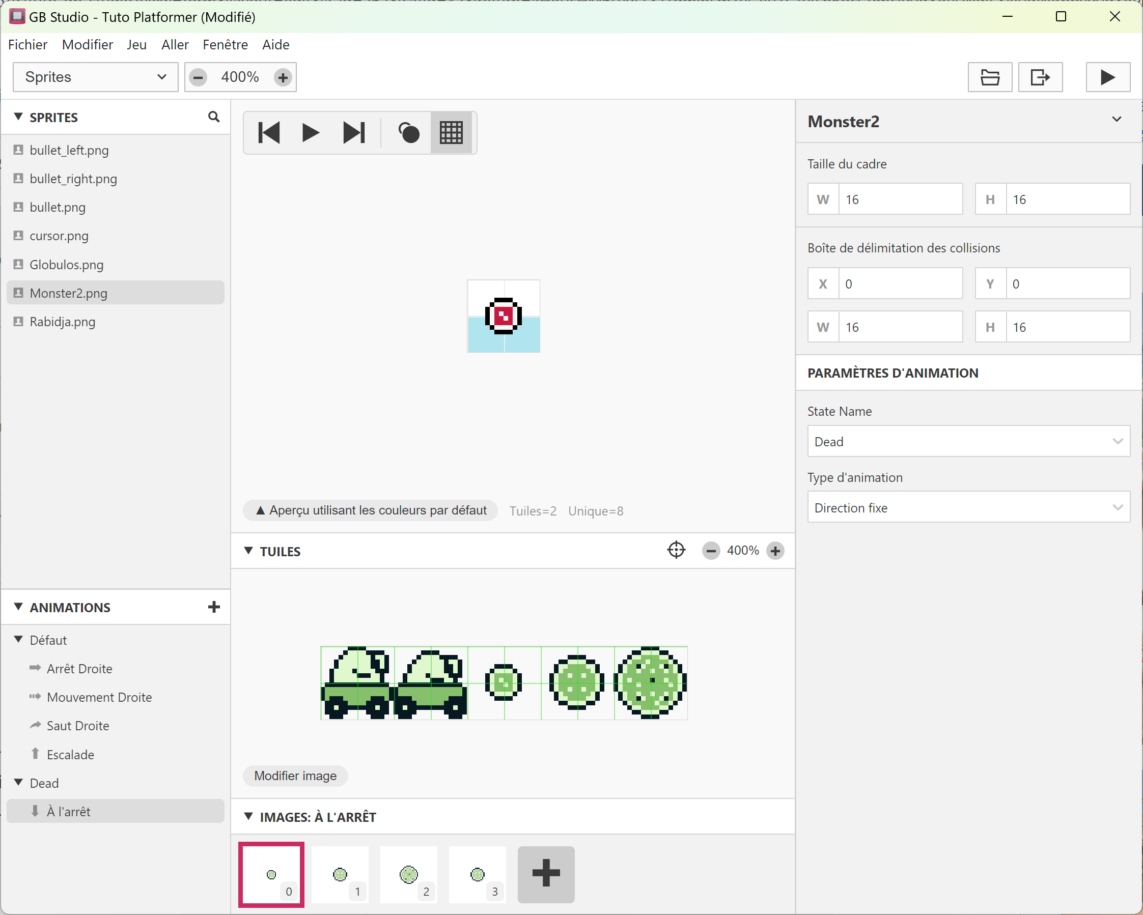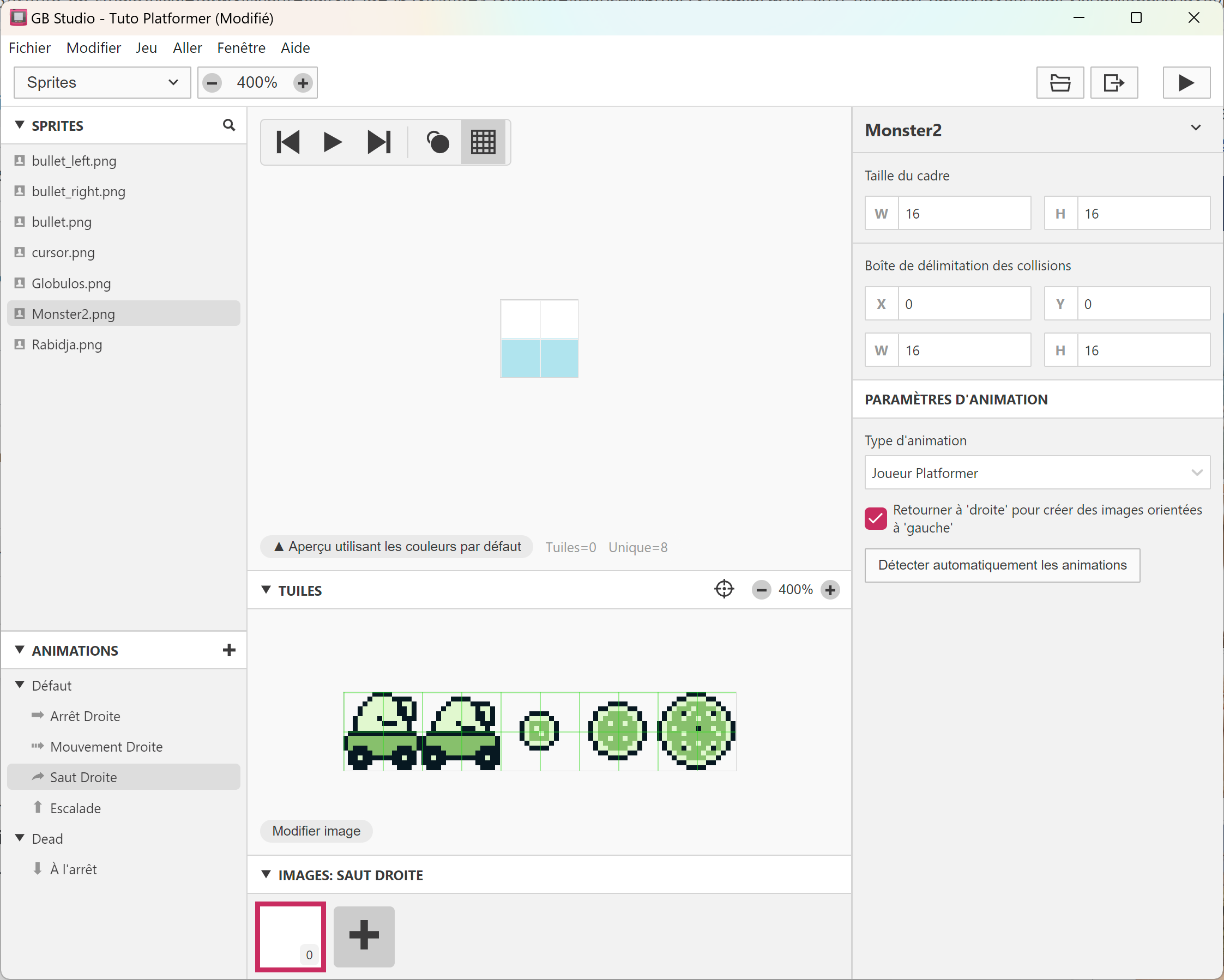 Ses animations apparaissent en bas, il suffit de cliquer dessus et de créer les frames en copiant / collant les tiles de sprites. L'animation statique et de marche seront les mêmes. Il n'y aura ni saut, ni escalade. Et il faudra rajouter une animation Dead en clquant sur + en face d'Animations. Vous pouvez regarder comment est fait le Globulos pour vous en inspirer. 😉