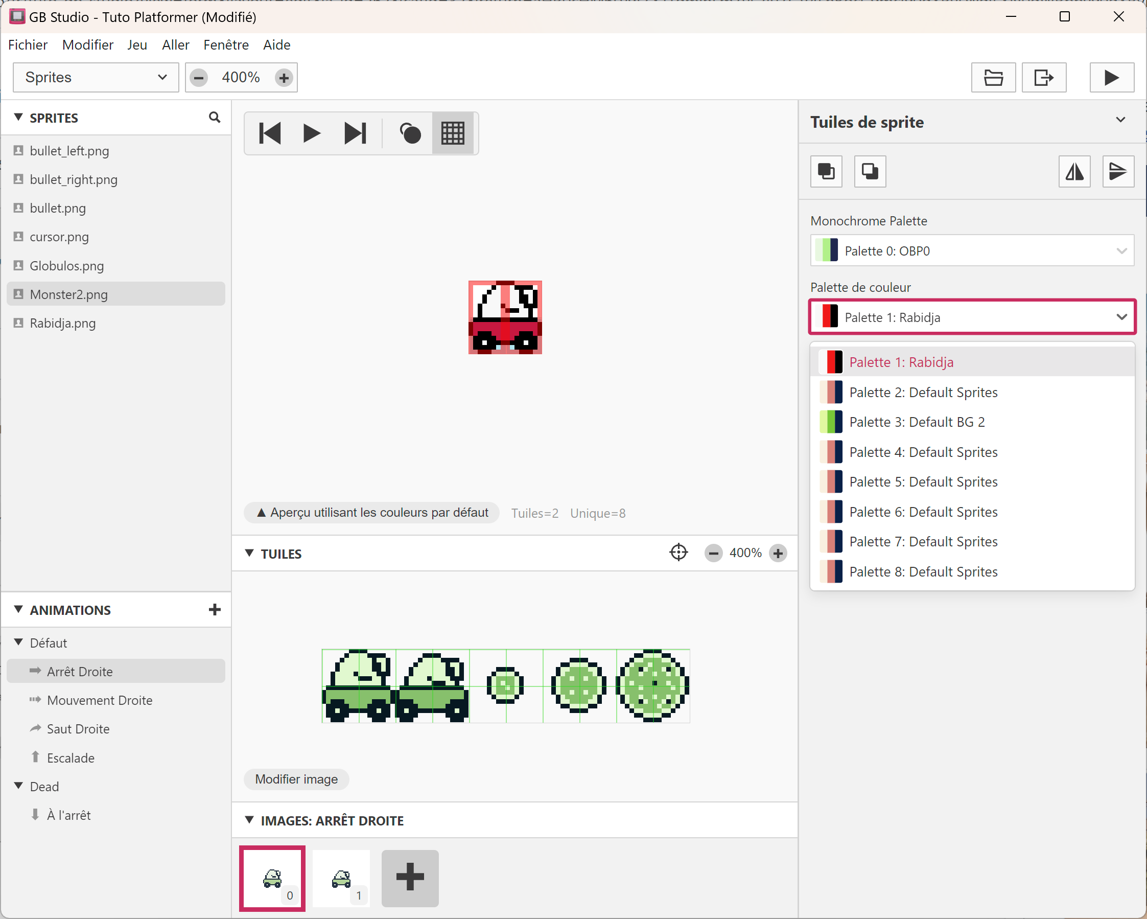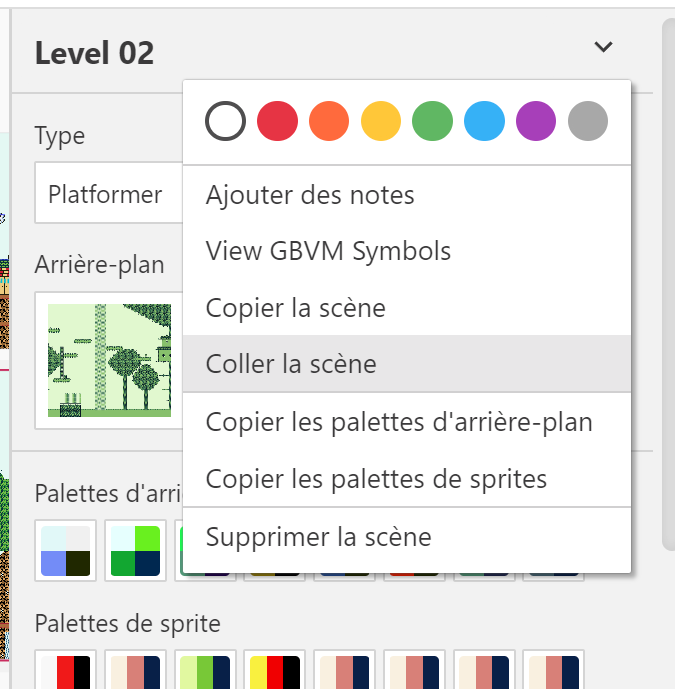 Pour changer la couleur de votre sprite, sélectionnez les tiles de sprites, frame par frame et changez la palette en haut à droite. Vous pouvez créer votre propre palette personnalisée pour vos sprites mais n'oubliez pas de les ajouter dans le menu de Scène pour vos niveaux, car oui, un même sprite peut avoir des palettes différentes selon les niveaux. C'est pour ça que dans les vieux jeux, les monstres changeaient de couleur pour devenir plus forts dans les niveaux plus élevés, cela évitait de dessiner d'autres monstres qui auraient pris trop de place en mémoire. 😉