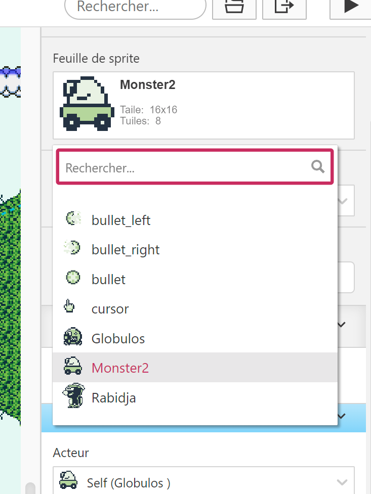 Maintenant, cliquez sur la feuille de sprites et changez-la par celle de votre nouveau monstre. Si les noms de ses animations sont identiques, cela devrait fonctionner sans rien changer (sinon, il faut changer le nom des animations dans les blocs de code).