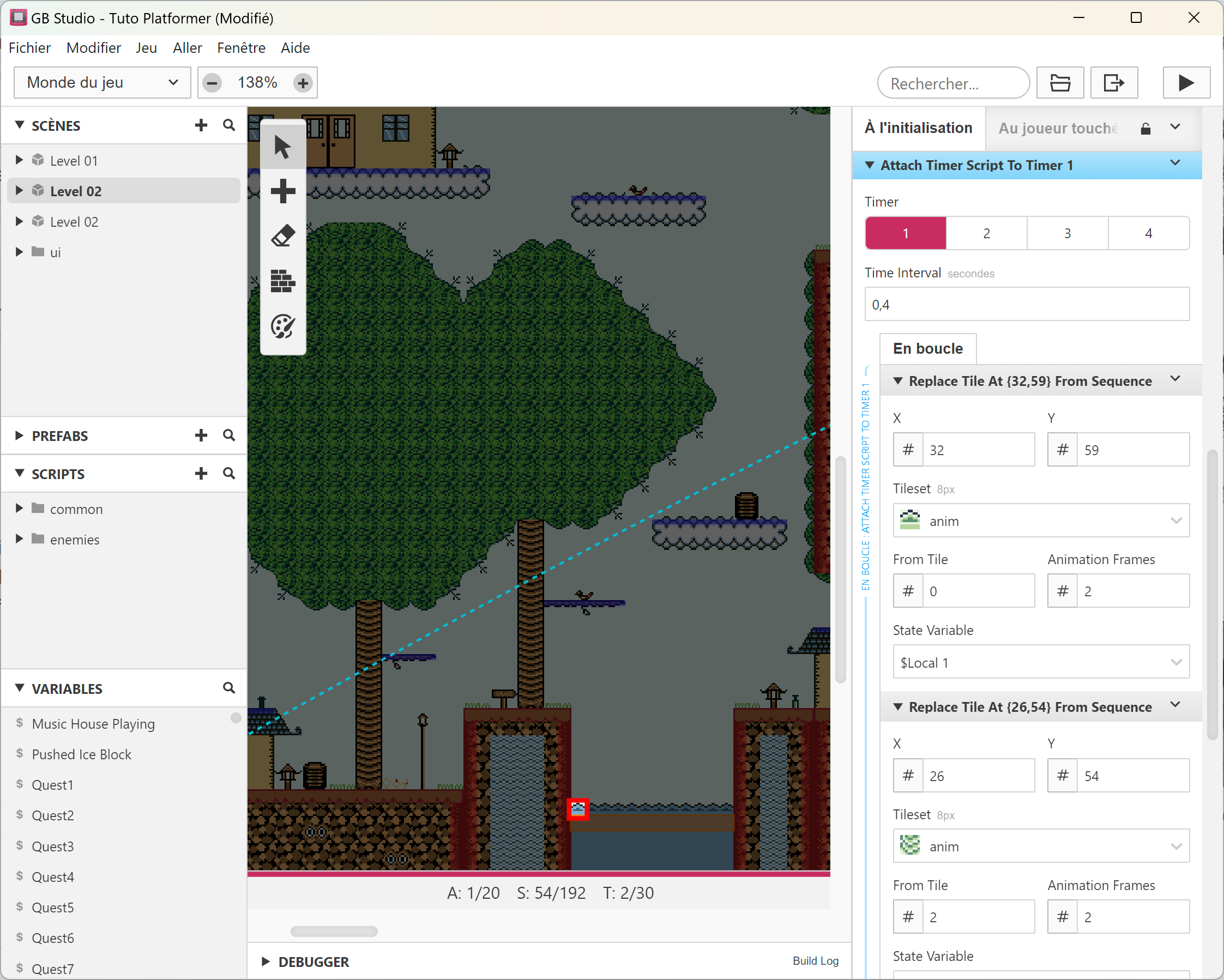 Attention aussi aux tiles animées. Vous pouvez mettre des tiles animées dans le dossier tilesets des assets. Je m'en suis servi pour animer l'eau et les cascades. Si vous voulez le modifier, il faut indiquer au programme un exemple de tile eau et de tile cascade (un seul suffit pour tout le niveau). Si vous ne l'utilisez pas, vous pouvez simplement supprimer cet événement.