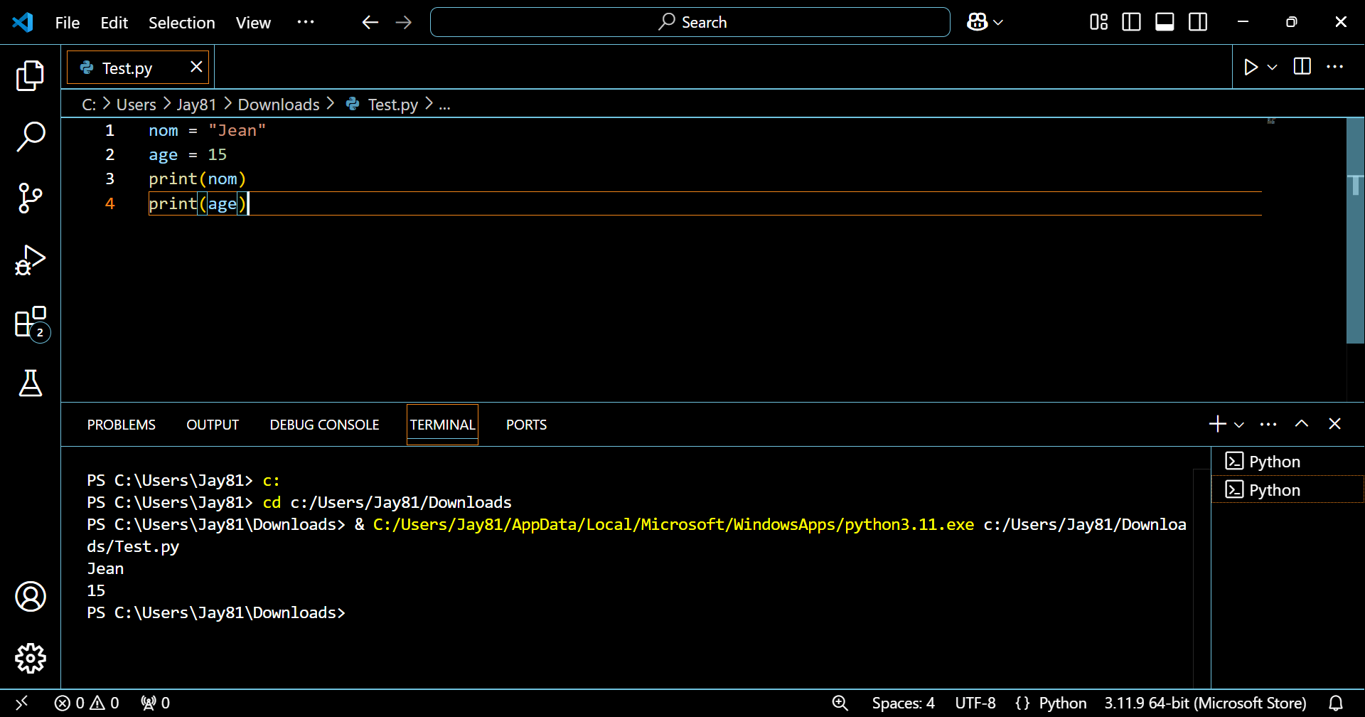 Si vous cliquez ensuite sur la flèche en haut à droite pour lancer le programme, vous obtiendrez Jean et 15 dans le Terminal.