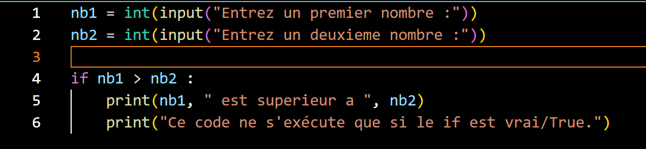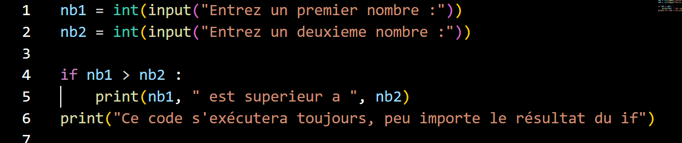 Ainsi, suivant l'indentation, dans ce bout de code, le dernier print() ne s'exécutera que si le if nb1 > nb2 est vrai, car il se trouve indenté "sous" lui :