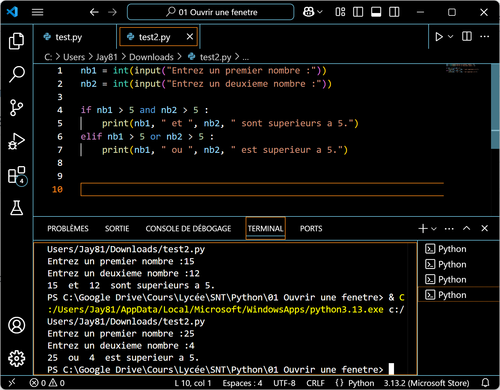 - L'indentation : elle est très importante ! Il s'agit de laisser un espace en utilisant la touche TAB sous les conditions afin de savoir quel code sera exécuté sous quelle condition.