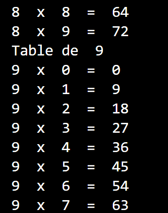 Le code suivant va afficher les tables de multiplication de 0 à 9 :