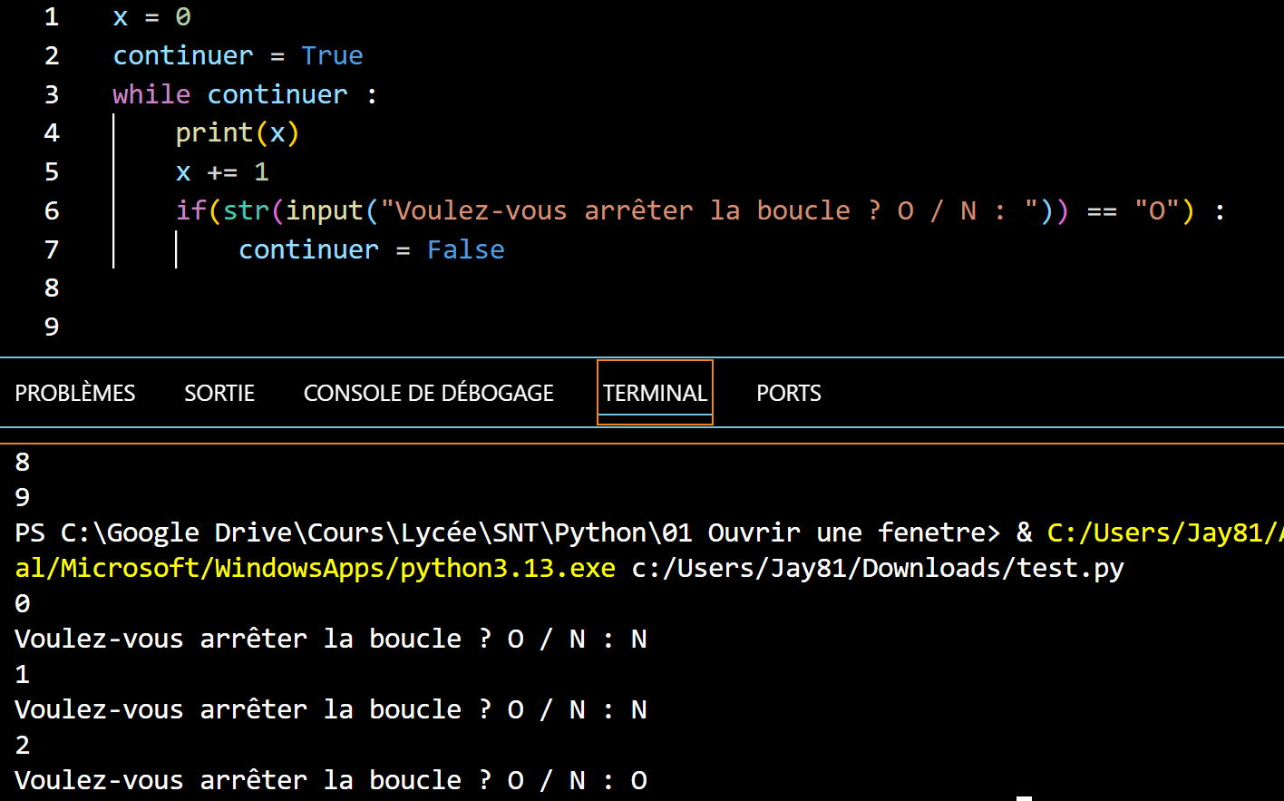Cette boucle ressemble à la précédente et fait la même chose (elle afiiche les nombres de 0 à l'infini), sauf que cette fois, elle va demander à chaque tour de boucle à l'utilisateur s'il veut arrêter. Si celui-ci répond "O", on va passer la variable continuer à False pour arrêter la boucle. 😉