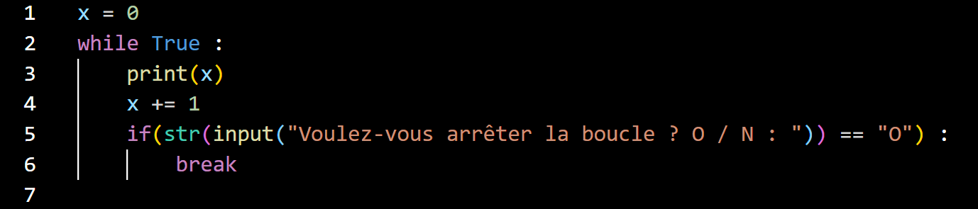 Mais on s'en sert plus souvent pour créer des boucles infinies qui s'arrêteront, par exemple, à la demande de l'utilisateur comme dans l'exemple suivant :