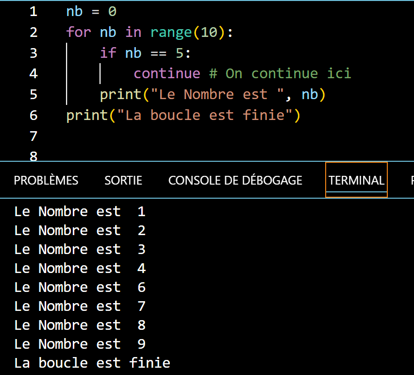 Dans cet exemple, on reprend l'affichage de nos nombres de 0 à 9, sauf que quand celui-ci est 5, on "saute" la boucle et on passe directement à 6 sans écrire 5.