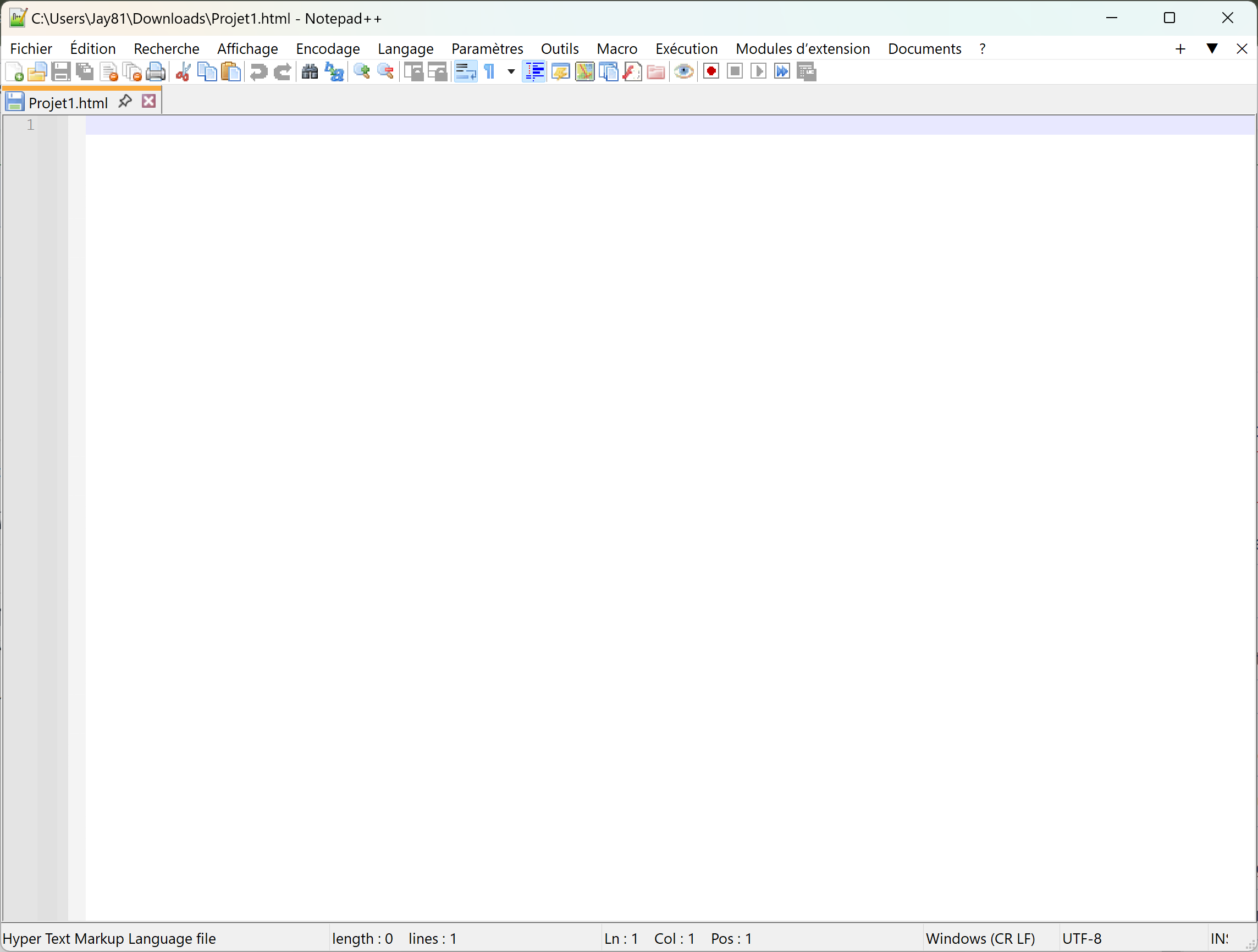 Ouvrez ensuite Notepad++ et choisissez Fichier -> Ouvrir -> Puis le nom de votre fichier : Projet1.html.