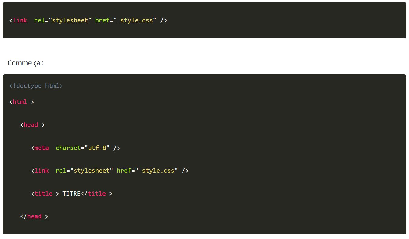 Pour que votre fichier HTML sache où aller chercher le code CSS que nous allons rentrer, il va falloir ajouter le code suivant entre les balises <head> et </head> :