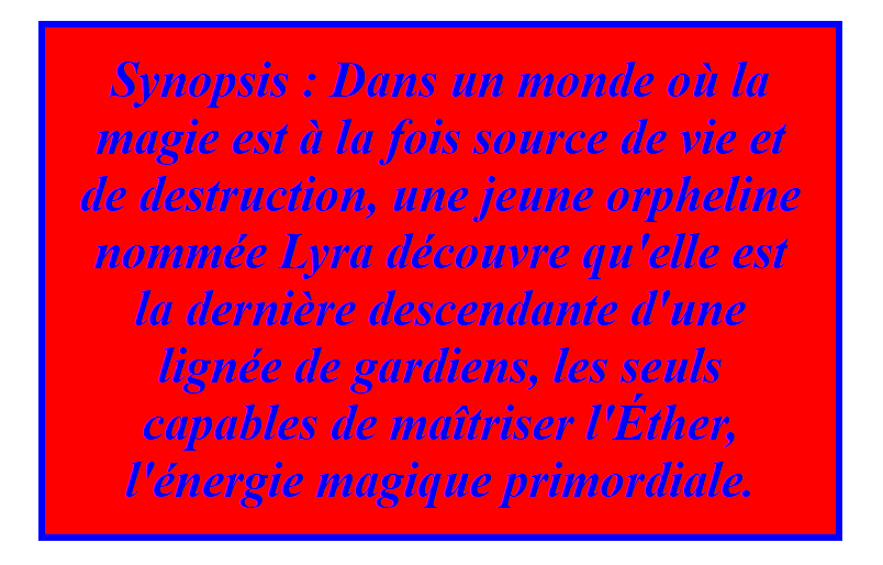 Synopsis : Dans un monde où la magie est à la fois source de vie et de destruction, une jeune orpheline nommée Lyra découvre qu'elle est la dernière descendante d'une lignée de gardiens, les seuls capables de maîtriser l'Éther, l'énergie magique primordiale. Lyra est propulsée dans une aventure épique à travers des royaumes fantastiques, des forêts enchantées aux cités flottantes, pour apprendre à maîtriser ses pouvoirs et affronter une force obscure qui menace de plonger le monde dans le chaos. Sur son chemin, elle rencontre des alliés improbables : un elfe taciturne mais loyal, un nain bourru mais sage, et un magicien excentrique mais puissant. Ensemble, ils devront déjouer les complots, affronter des créatures mythologiques, et découvrir les secrets d'une ancienne prophétie qui révèle le destin de Lyra et du monde. |